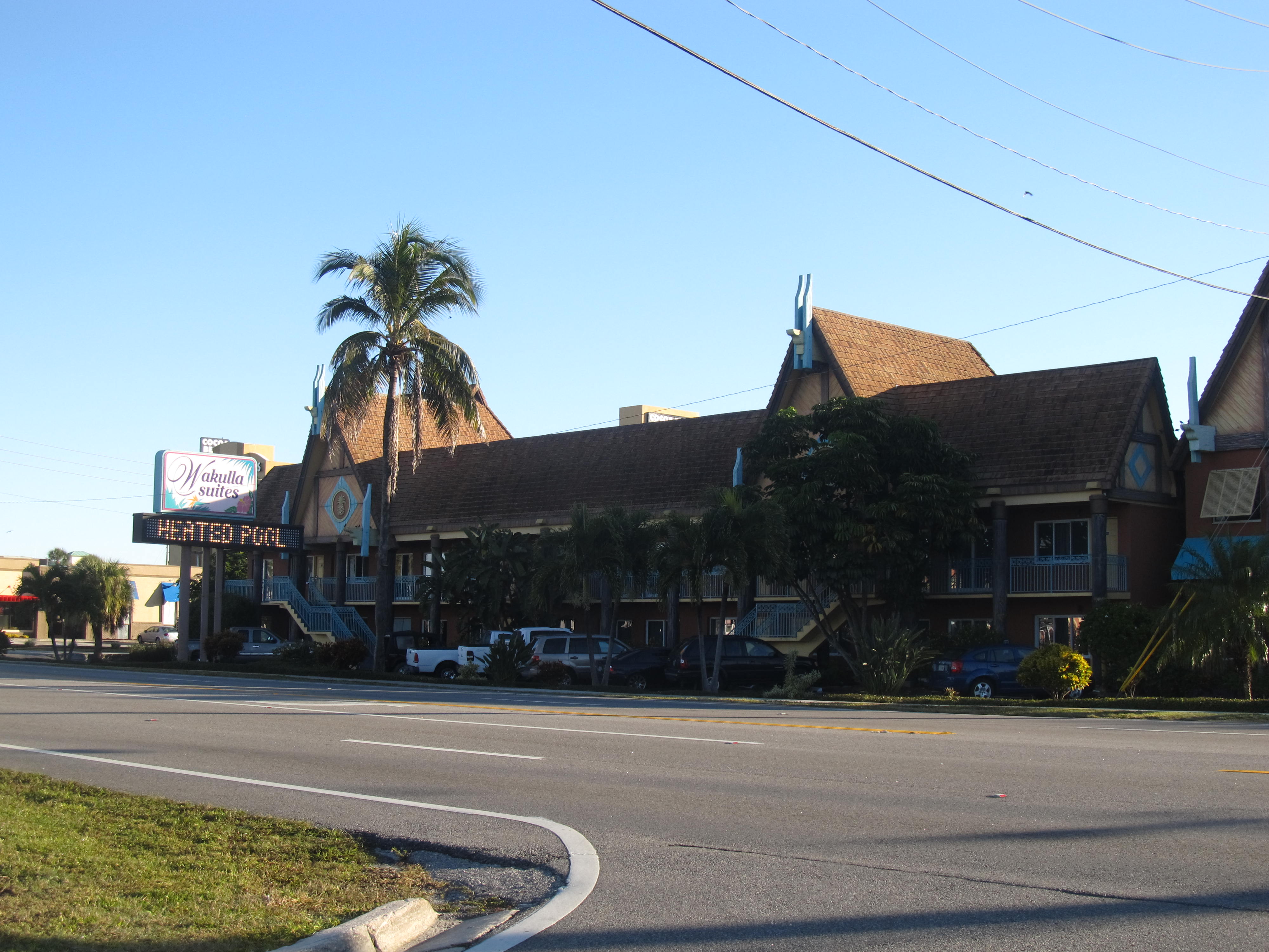 Night had fallen and as we rolled past Patrick Air Force Base, we started keeping our eyes open for that perfect motel. Shortly thereafter, the glimmering tower of true tourist trappings – the world famous Ron Jon Surf Shop (already a destination for us) – loomed in the night sky. But what are those flames? Can it be? Why yes! They’re giant tiki torches, marking the presence of the Wakulla Suites Motel. Perfect! A quick check on Yelp to make sure it wasn’t a complete dive (in fact, it rated 3 stars) and we were in!