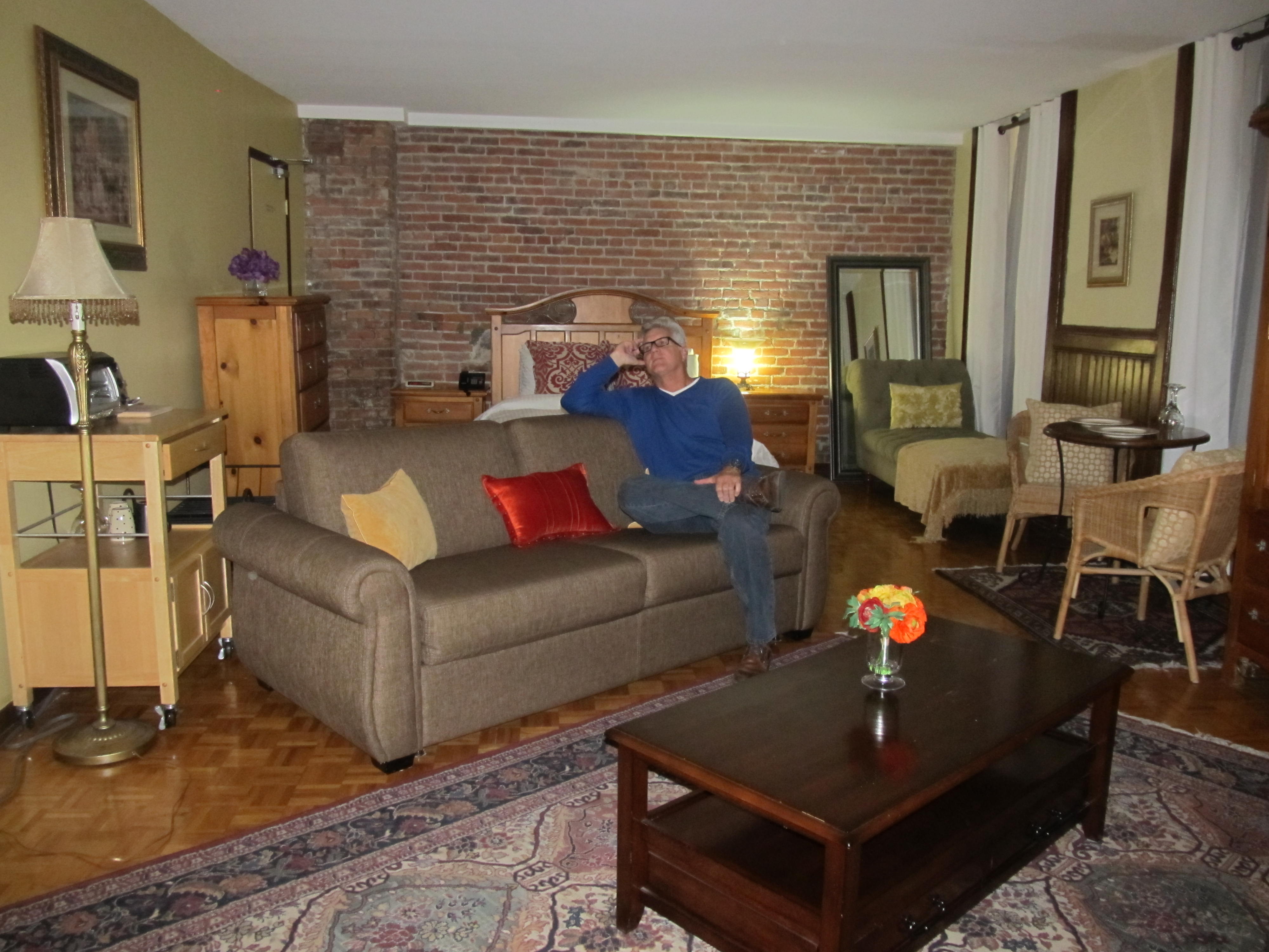 On arrival we grabbed a taxi and headed to our small inn, Auberge de la Place Royale, right on the river with views of the water and the port. Our queen suite on the third floor was a HUGE room with a large sitting area and charming décor complete with a brick accent wall.