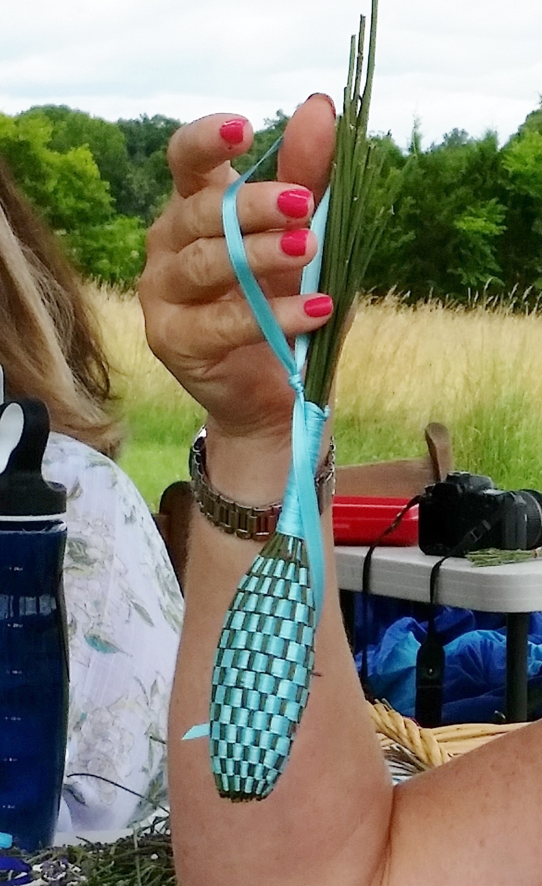 Judy decided she wanted to try out her crafting skills making a lavender wand. This required weaving ribbon between the folded-over stems of the lavender sprigs, such that the flowers were encased within the weave. Judy’s instructor, Monique, learned the art of lavender weaving at an early age in Belgium; she patiently worked with Judy, demonstrating the deft touch such weaving required.