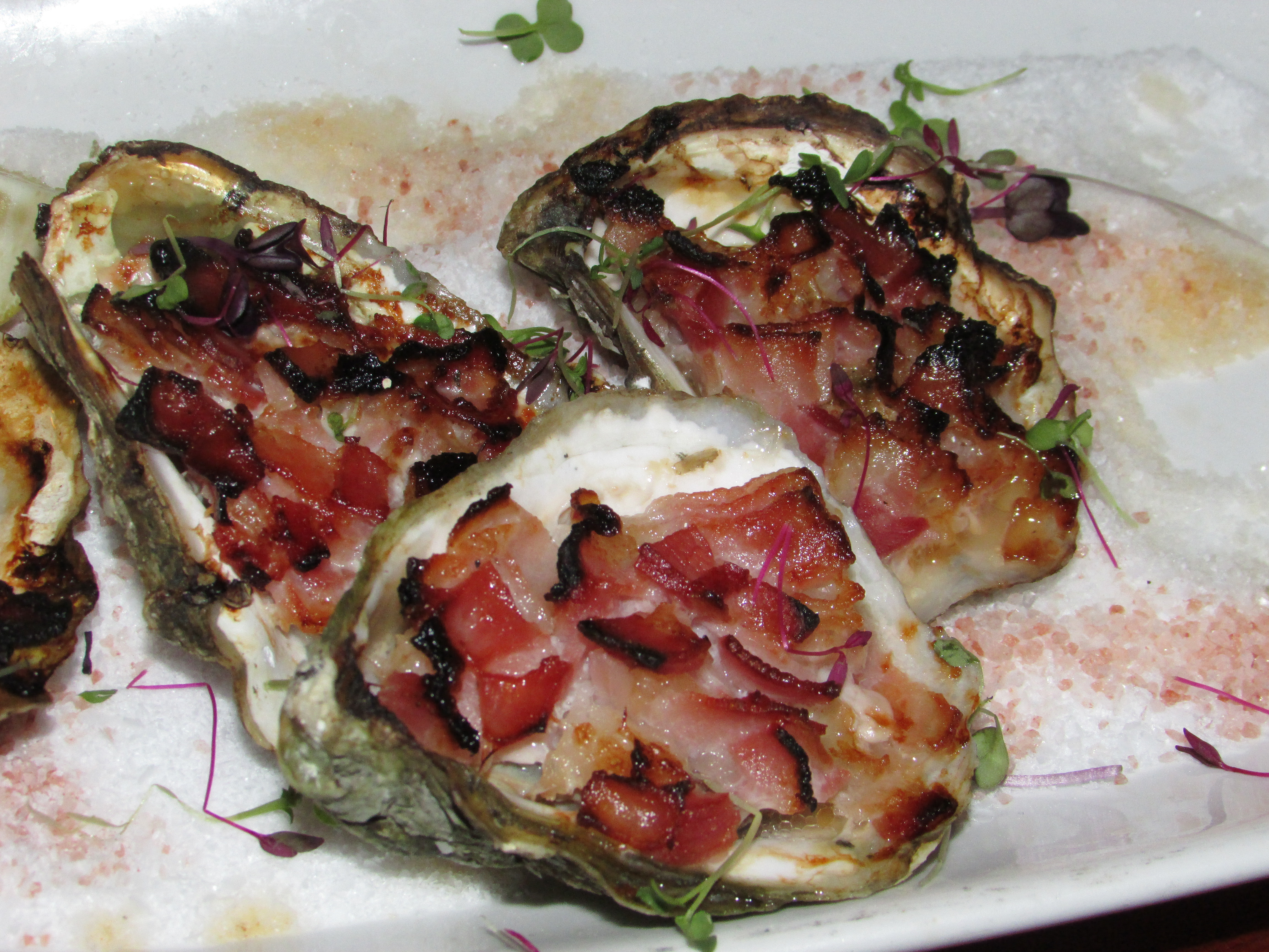 You’re wondering, “What on Earth is a Wally? Well, it’s a fresh oyster, topped with a little butter and bites of bacon that is run under the broiler to give it a quick crispy finish.
