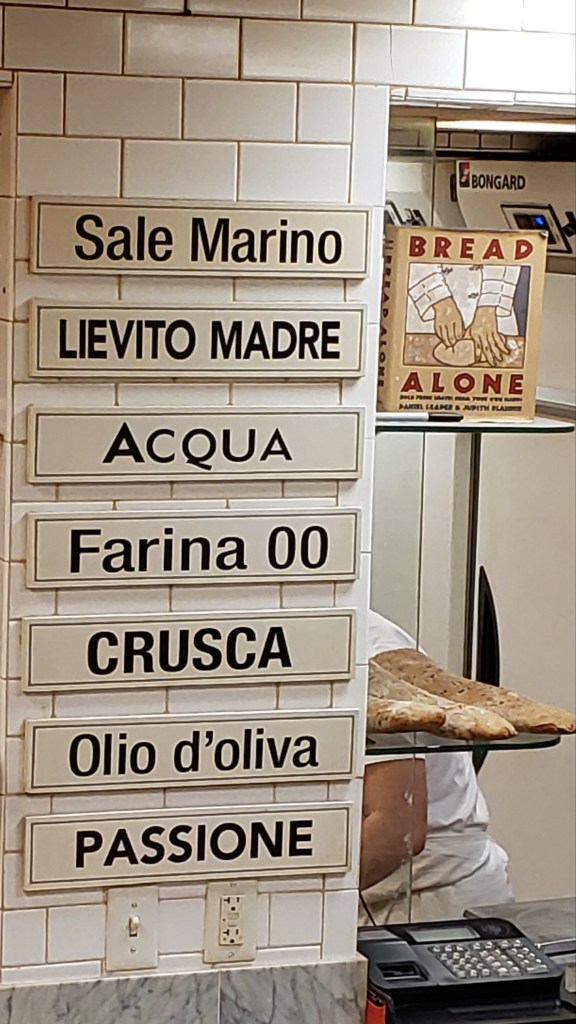 A couple of doors down we turned up a little alley and came to a small flight of stairs into the heavenly aroma of baking bread. The list on the wall  of Bricco Panetteria shows what goes into true Italian bread – culminating with passion. Clearly, from the flavor of the slice of authentic Roman pizza I enjoyed, this bakery includes a generous portion of that essential ingredient.