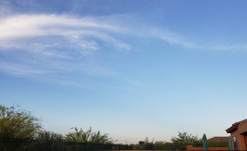 Before the pandemic, contrails were everywhere. There are all kinds of commercial jets that fly over the desert where we live. There are small, private planes constantly humming overhead, practicing turns and stalls. We’re close enough to Luke Air Force Base that we occasionally hear the incredible sounds of military jets “turning and burning” as they conduct training flights and exercises. I LOVE that sound.