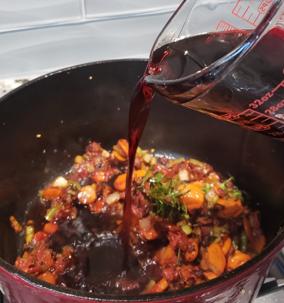 Step seven: Pour in two cups of wine. For me it boils almost immediately so I turn it down a bit and let it vigorously simmer till the wine is reduced by half.