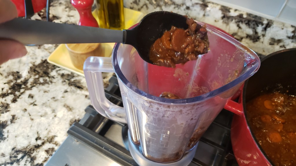 Puree it. All of it. This delicious, beefy, wine-flavored, veggie mess is gonna be the most scrumptious gravy you’ve ever eaten in your life. There’s no need to thicken anything, just blend it to a thick liquid.
