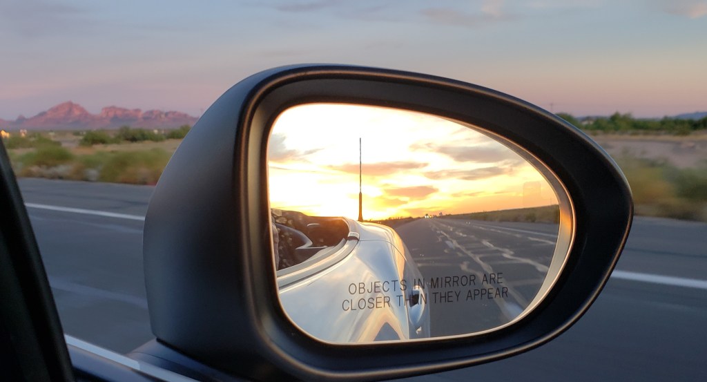 And then there was the end of a recent drive. We were less than an hour from home. The sun was setting and I glanced into the rear view mirror, grateful that the sun wasn’t shining below the sun visor and in our eyes. That’s when I noticed what was behind us. As the sun dropped lower on the horizon, brilliant colors lit up the sky. Sunset can be beautiful and this one was no exception.