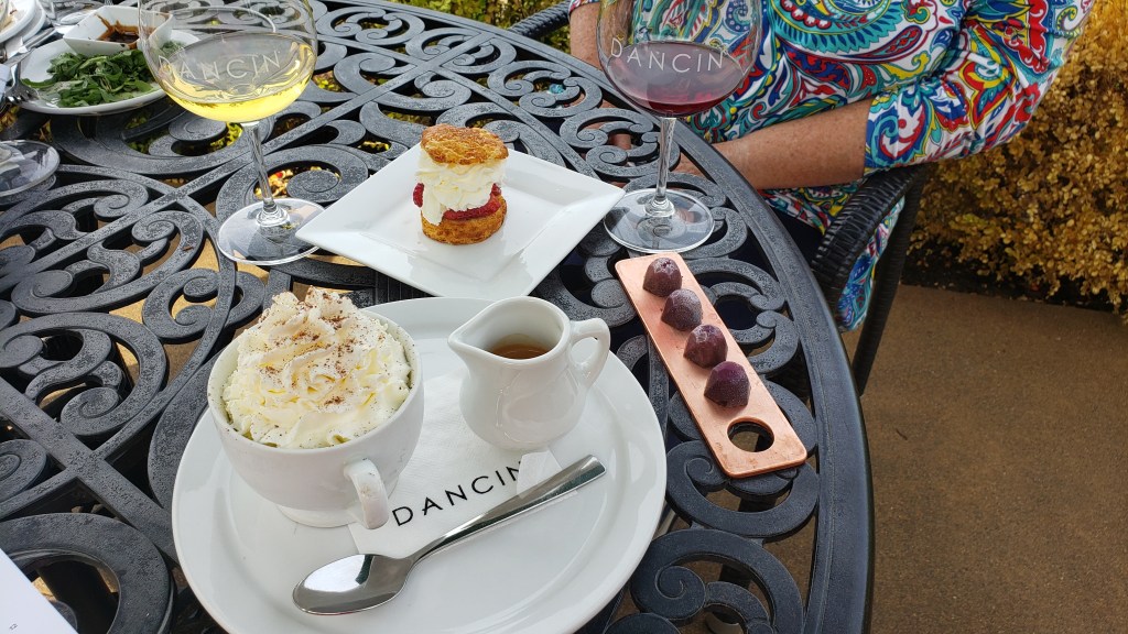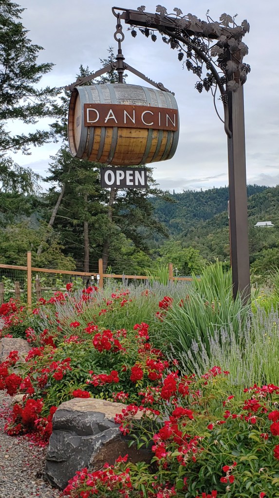 Over the weekend, we had a reservation at a local winery, Dancin Vineyards. A solid menu offered lunch choices including a delicious stone-fired pizza. We sipped and chatted and I marveled at the view under blue skies as the waitress described where the grapes from my wine grew.