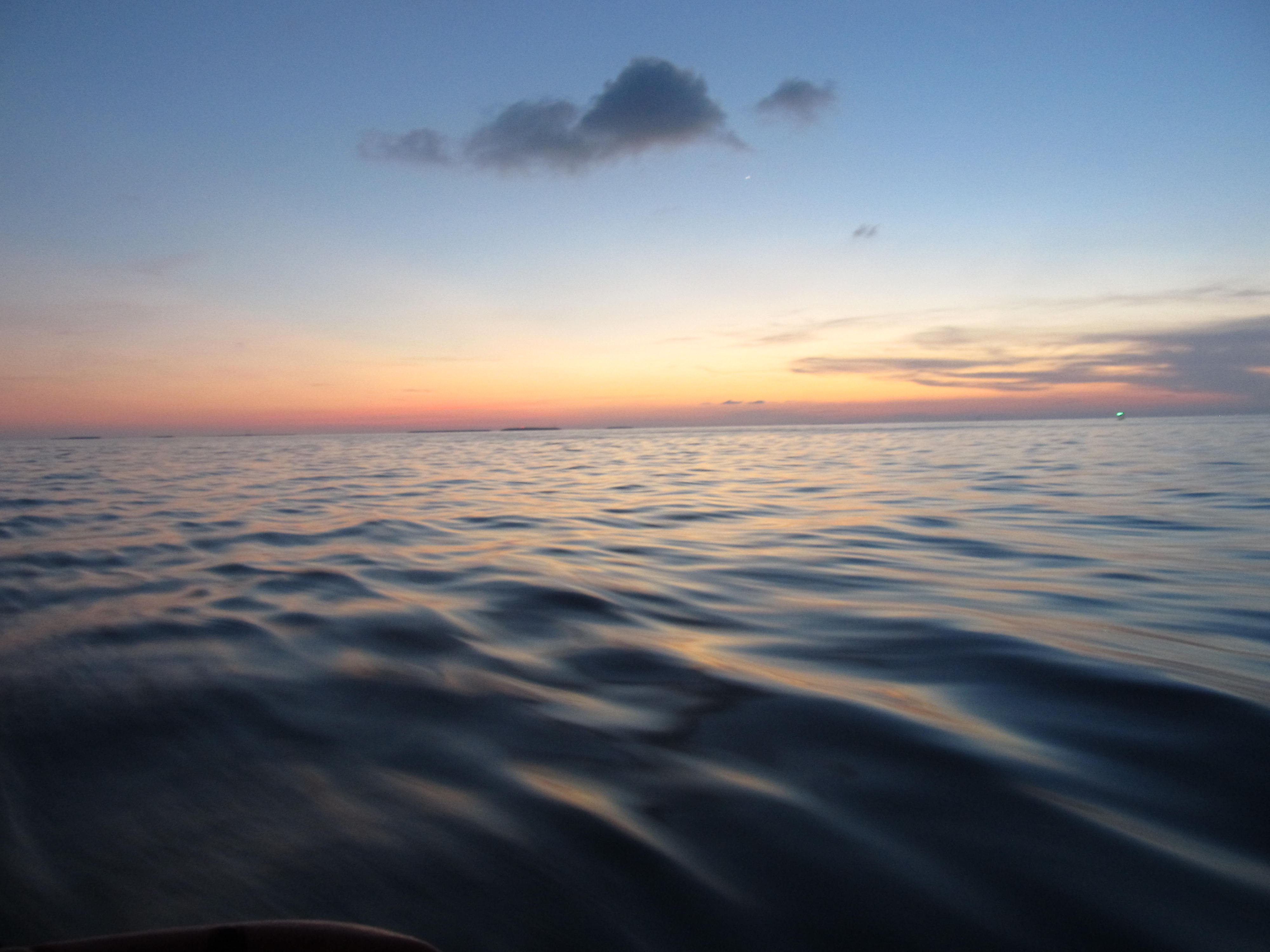 Out of the twilight the first stars appear and before your eyes the moon disappears in the complete blackness of night. All the variations of planets can be identified and reflected twinkles in the water can be seen so the lights on the horizon, the azures, seemed like a little string of diamonds of stars captured from the evening sky