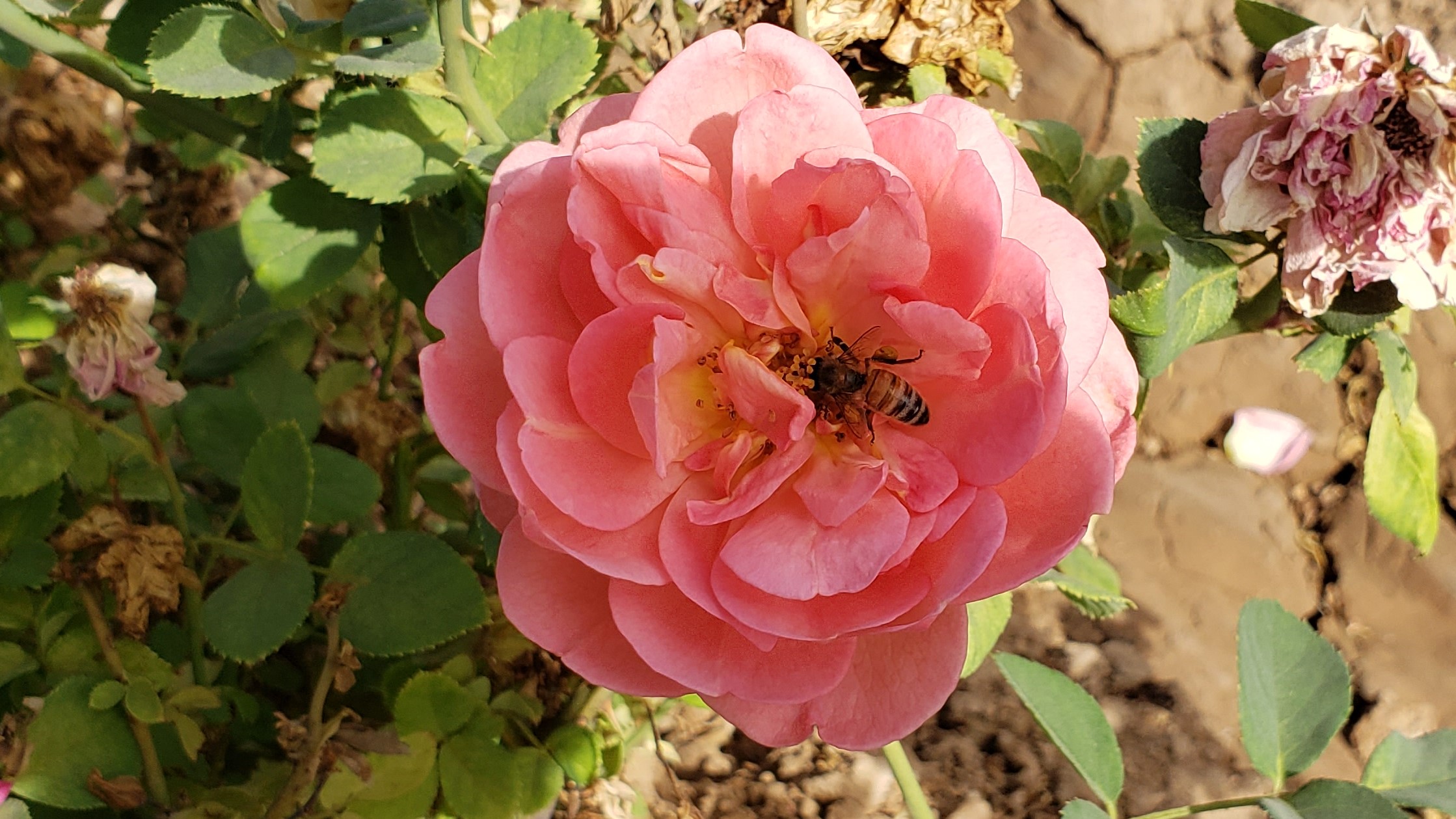 Up close, rose buds, full blooms and those at the end of their floral lifespan cluster together amid thorns in slightly muddy rows.