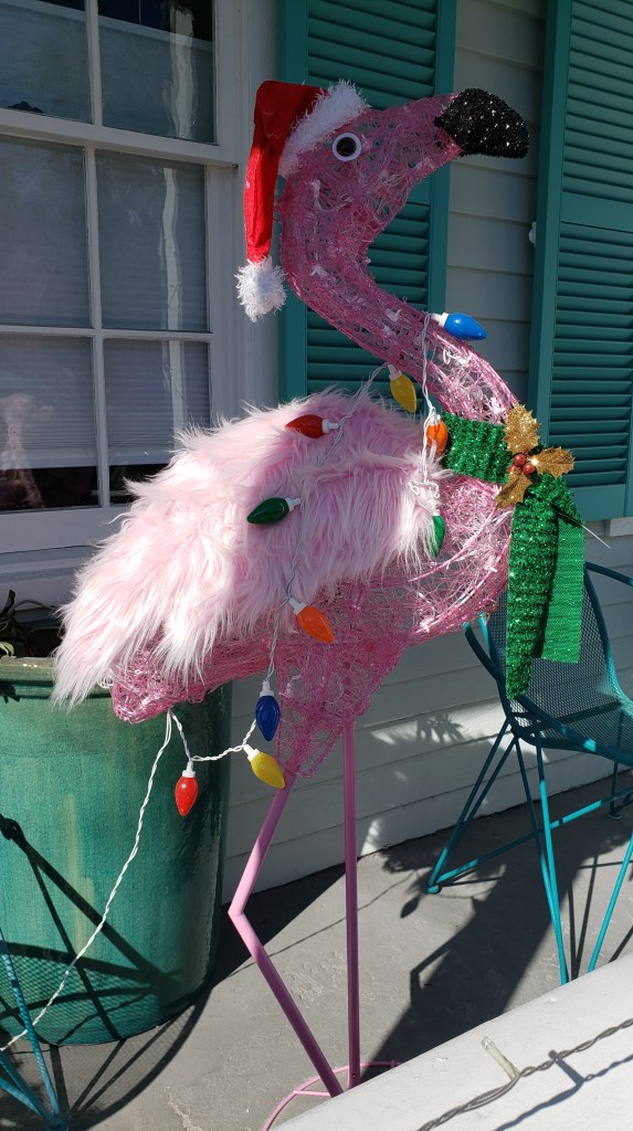 This crazy flamingo stayed in the shade of a porch while strutting her holiday finery.