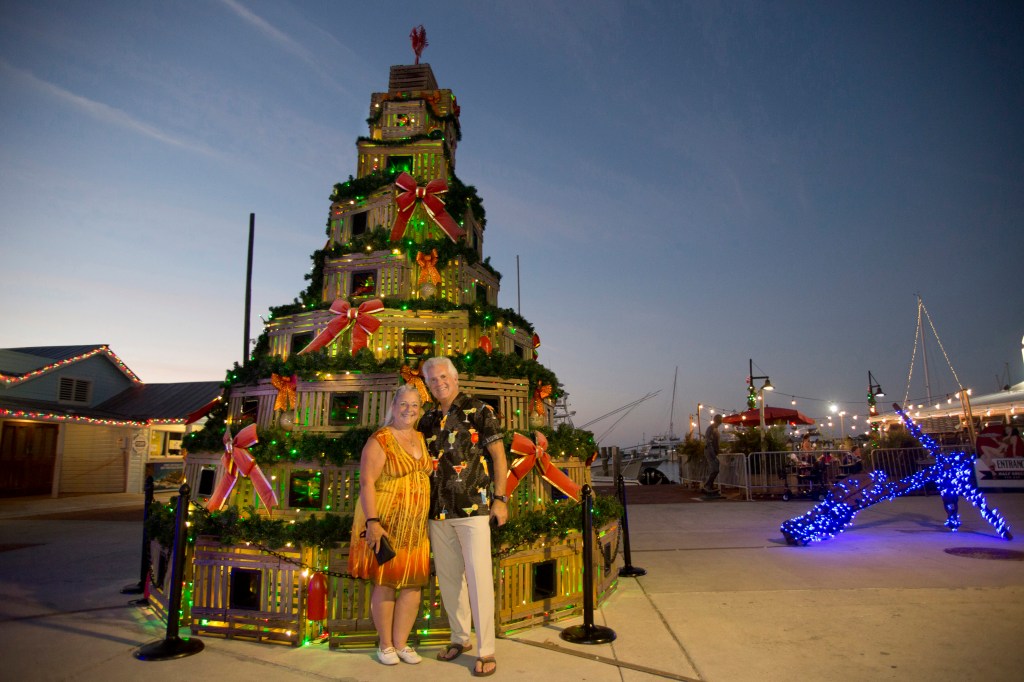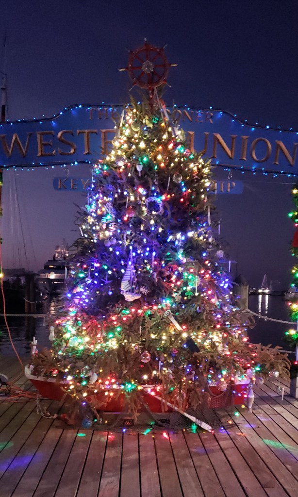 One particular favorite is rather iconic. Lobster pots are stacked on the waterfront and lighted. The tree is a hit with tourists and locals. A photographer friend (who was also our wedding photog), snapped a pic for us to celebrate our actual anniversary … same spot, same time of day, same scene six years later. (Thanks, Carol!!) We took our masks off just long enough to duplicate the picture.
