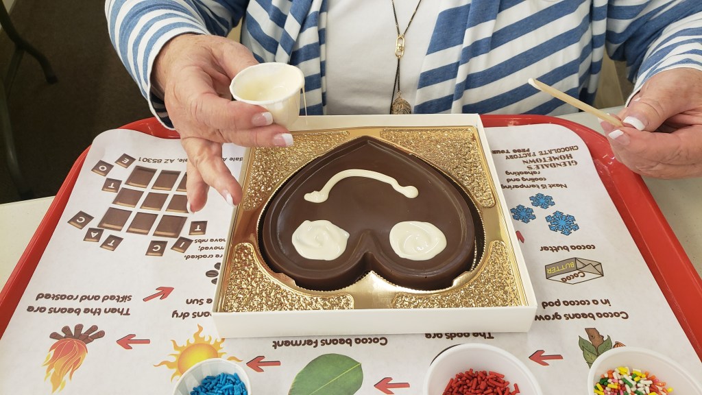 The tour costs a mere $5, but you can upgrade with a number of “DIY” options that allow you to linger afterward and decorate your own take-home treat. We decided, since it’s so close to Valentine’s Day, to test our artistic skills on a chocolate heart.