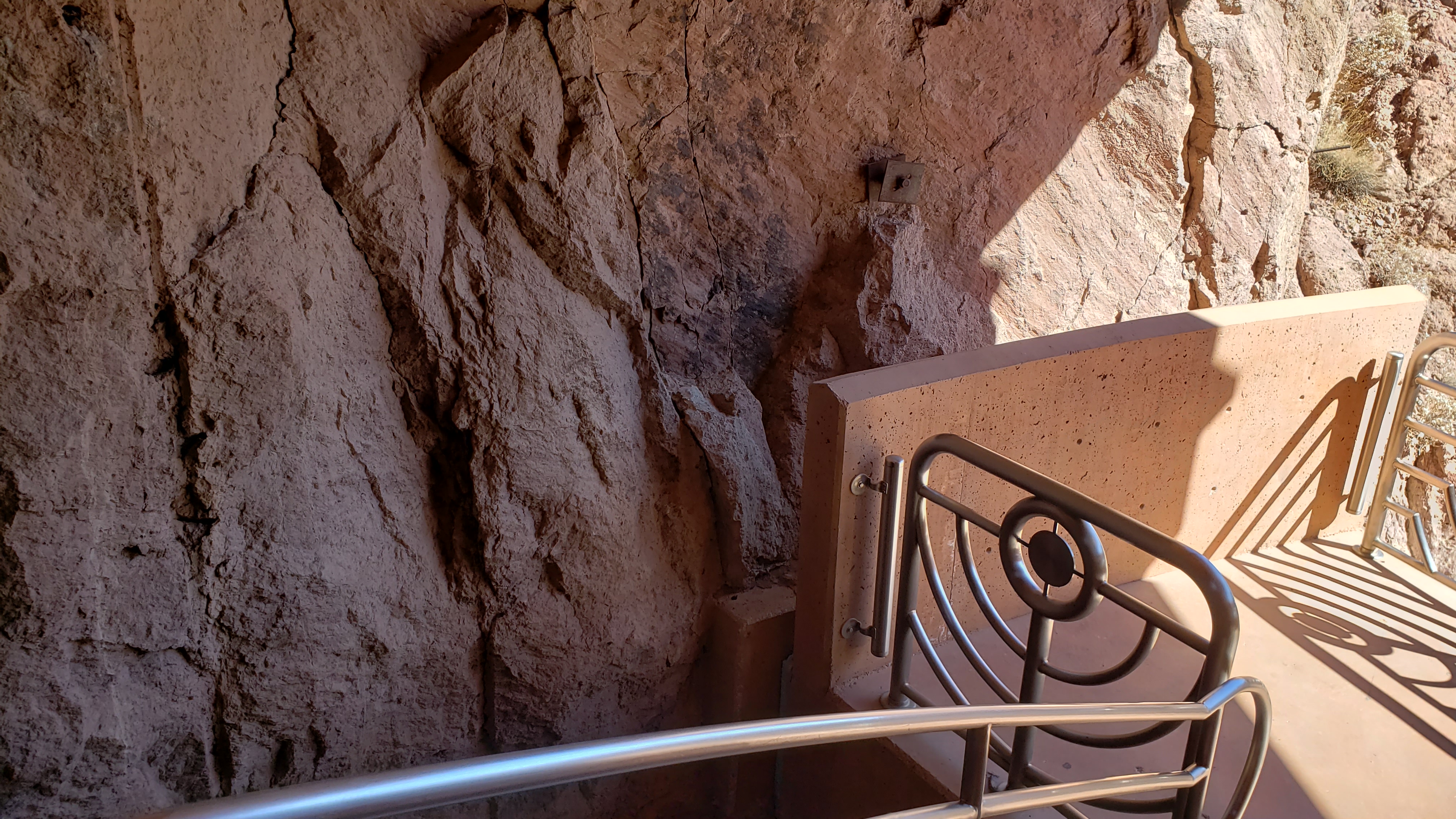 From the higher vantage point, look down into the spillway tunnel and imagine the last time the water was high enough to fill it with gushing torrents of water. (It was 1983)