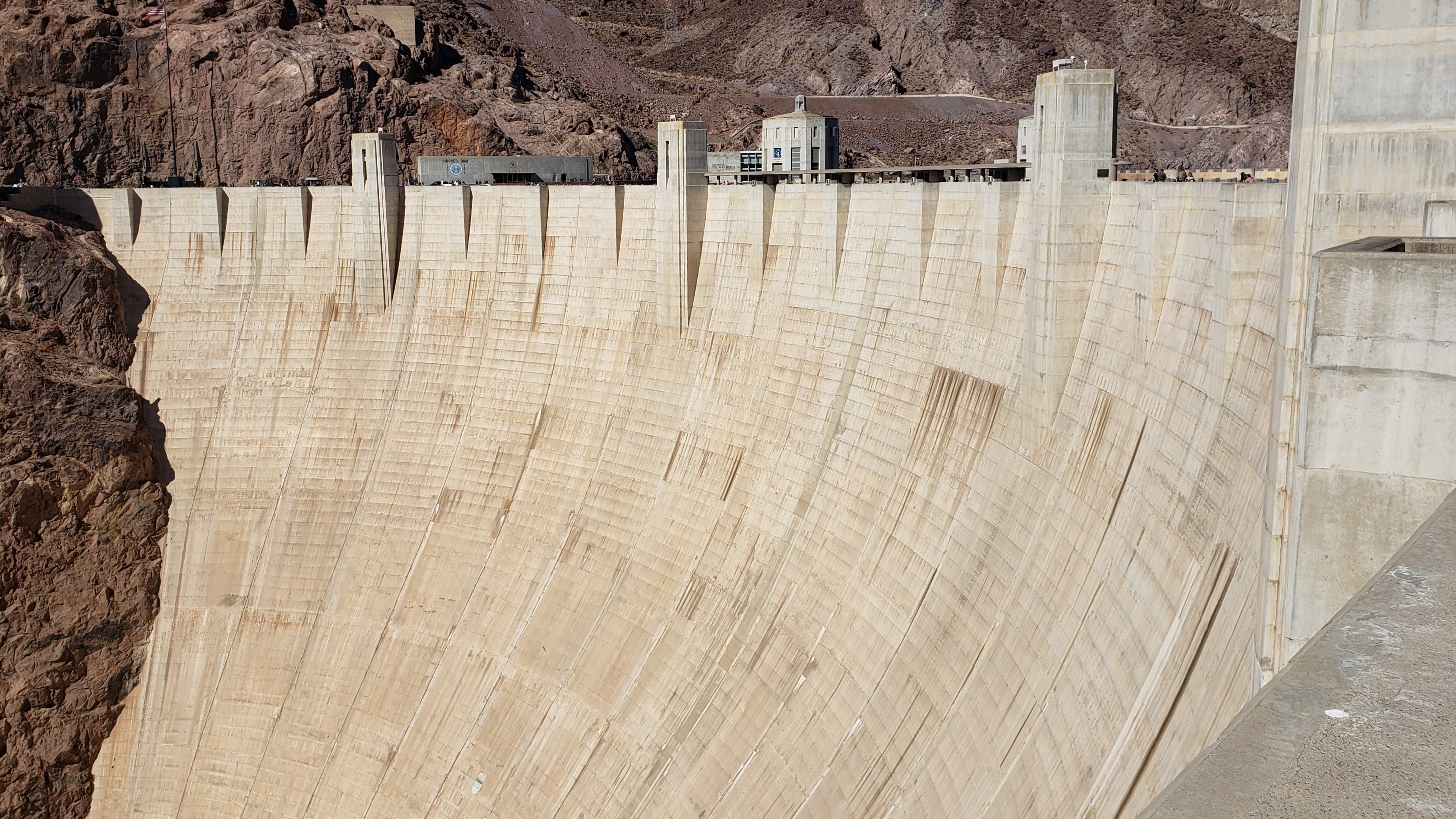 The south side shows off the engineering marvel of a massive concrete dam that experts say is still curing nearly ninety years after construction.