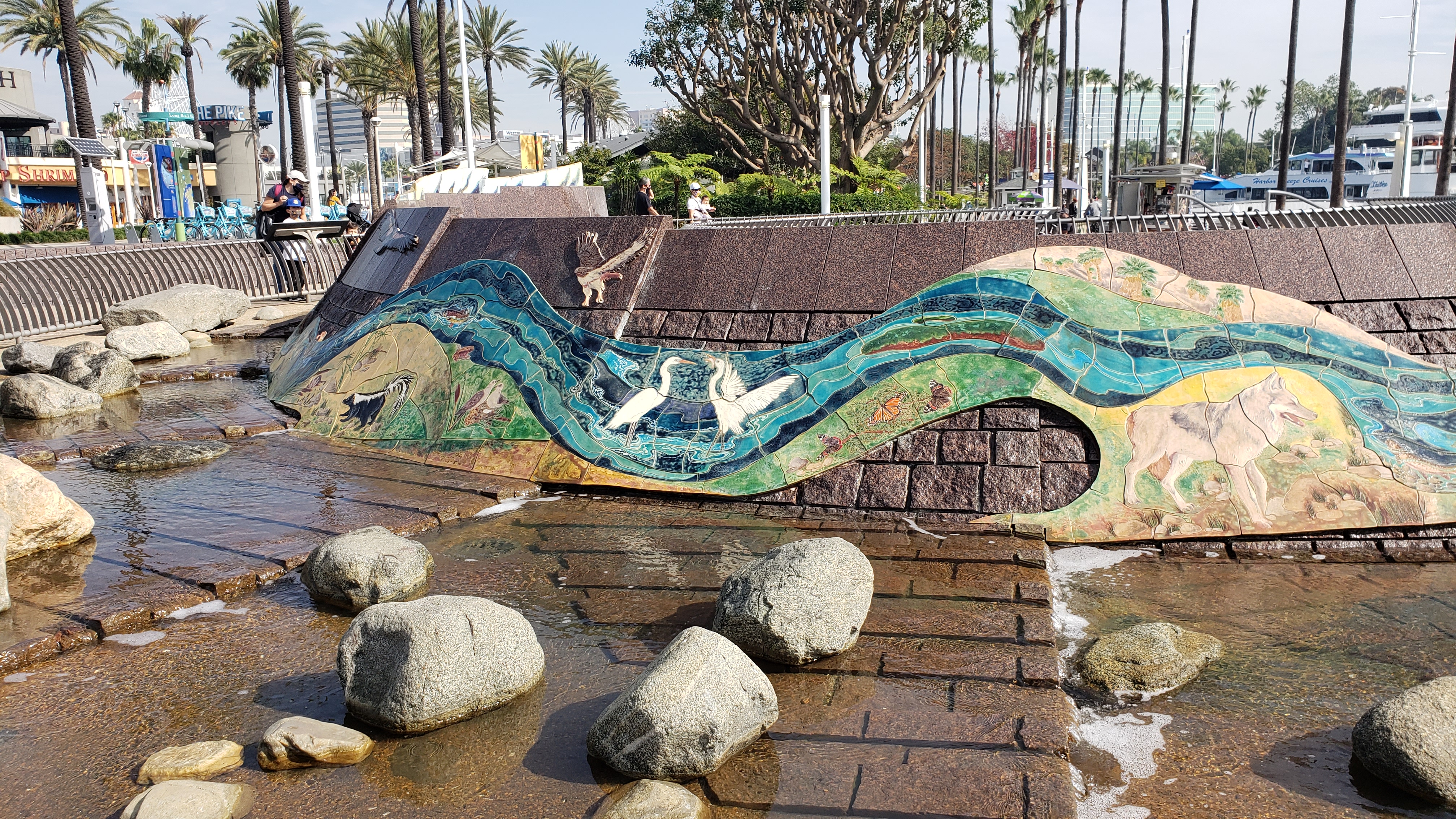 We’ve admired the mosaic fountain outside the aquarium at Long Beach, California.
