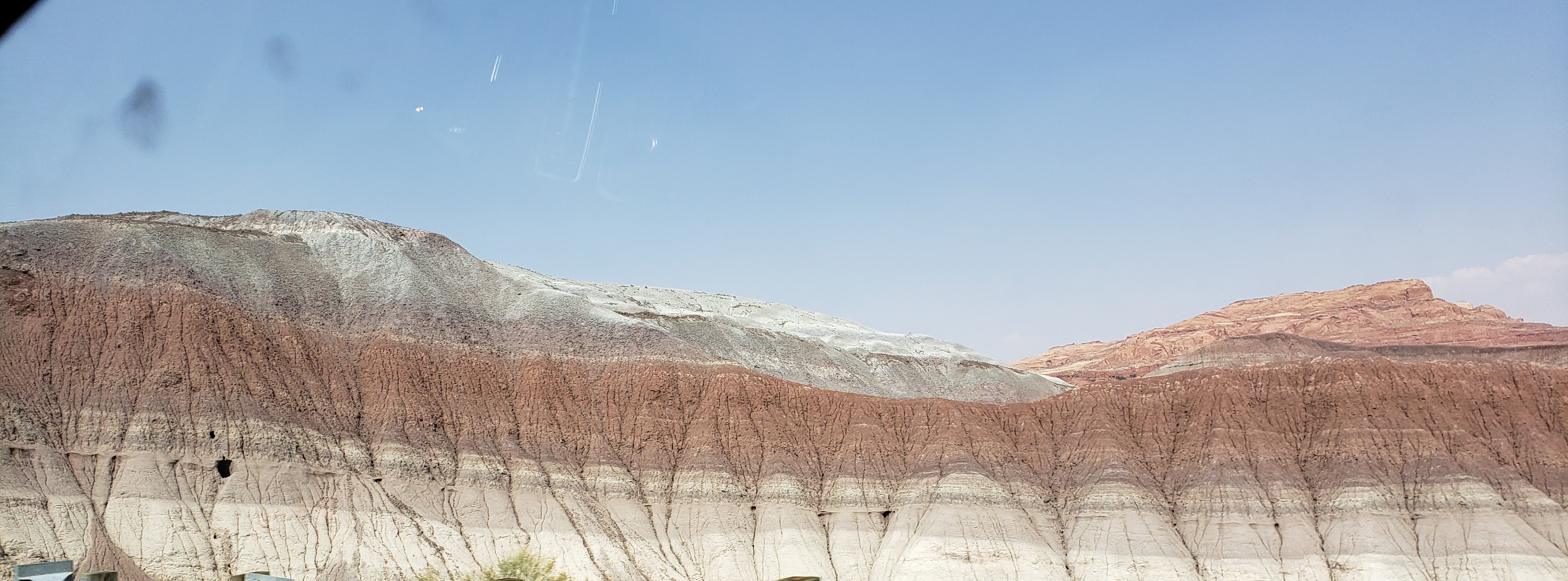 We headed north and west on Route 89 through the northern Arizona plateau, gazing at the constantly changing landscape as we rolled into Utah. The heat was unrelenting so the top stayed up until we got to Kanab, where we stopped at an outfitters to get Lizzie a long-sleeved shirt for a horseback ride later in the week. Since the temps cooled slightly as we drove up the Mt. Carmel highway, we lowered the top so we could really enjoy the views.
