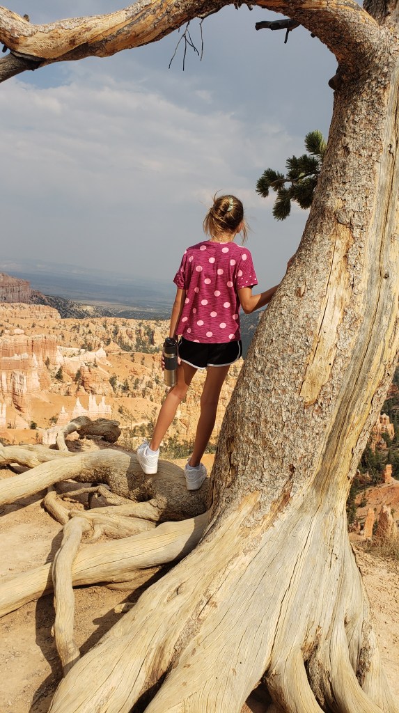 To say Lizzie was in awe was an understatement. Together, we walked to Sunrise Point, each taking tons of pictures along the way, and both Judy and I being nervous “parents” when Lizzie got anywhere close to the edge. Having fulfilled the shock and awe part of the day, we headed back to the cabin to unpack and decompress from the drive. We played some games and ate our dinner of leftover pizza and quesadilla, Judy and I both wishing for a cocktail accompaniment. Sated, we headed back out to experience the Amphitheaters at sunset. It was a bit anticlimactic due to too many clouds, but Lizzie had a great time walking partly down the hiking trails, every corner a new site.