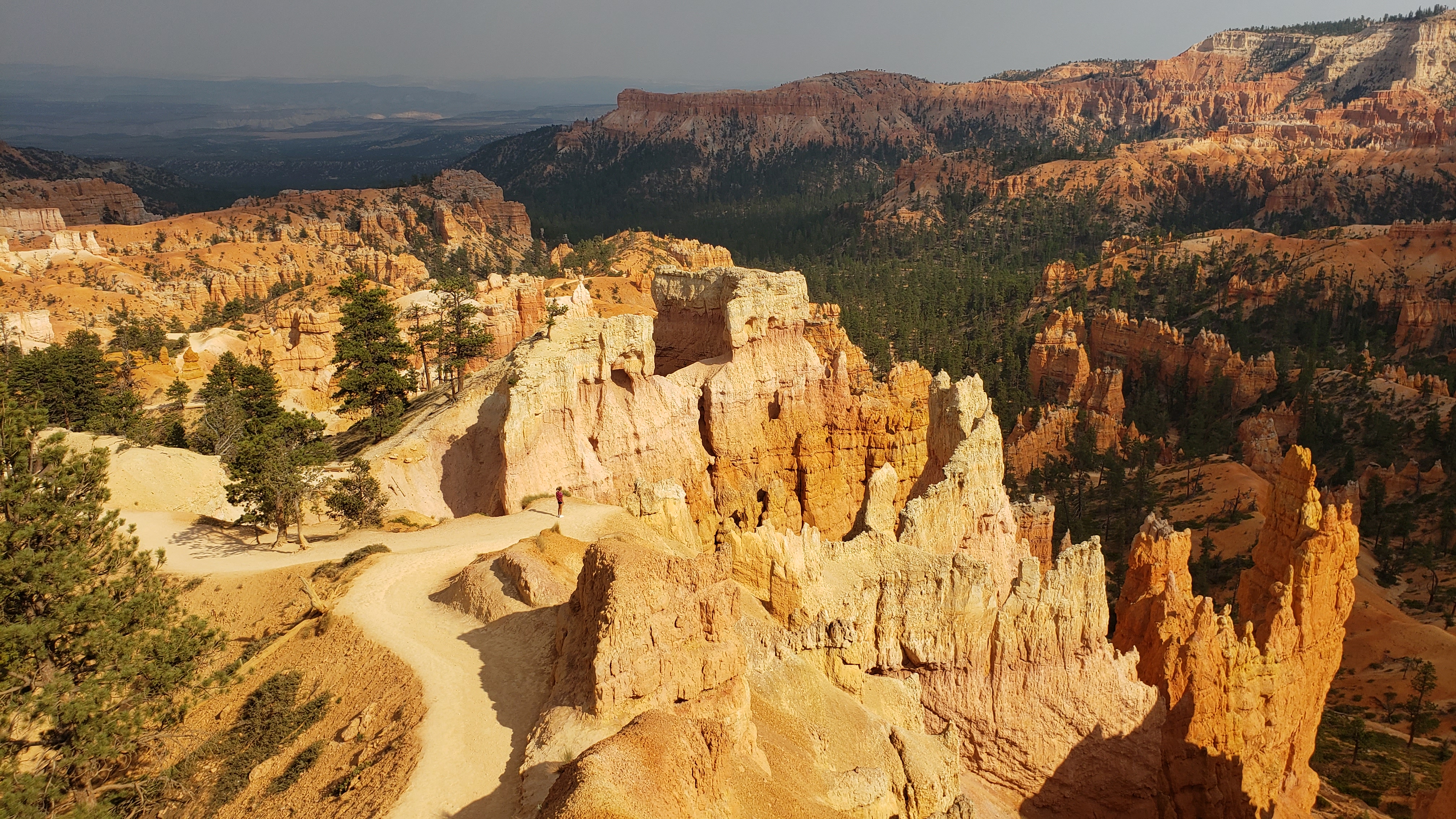 Filtered by high clouds, the early morning sunlight brings new shadows to the display of hoodoos in the Bryce Canyon Amphitheaters. Off in the distance, at least seven different ridges jut from the haze (a by-product of wildfires in California, Oregon and Idaho) in varying shades of blue-gray. The sound of a single-engine light aircraft draws my eyes skyward. I want to see this dizzying landscape from the air! But here on the ground it is truly special. I am taken aback by these one-of-a-kind vistas that took millions of years to form.