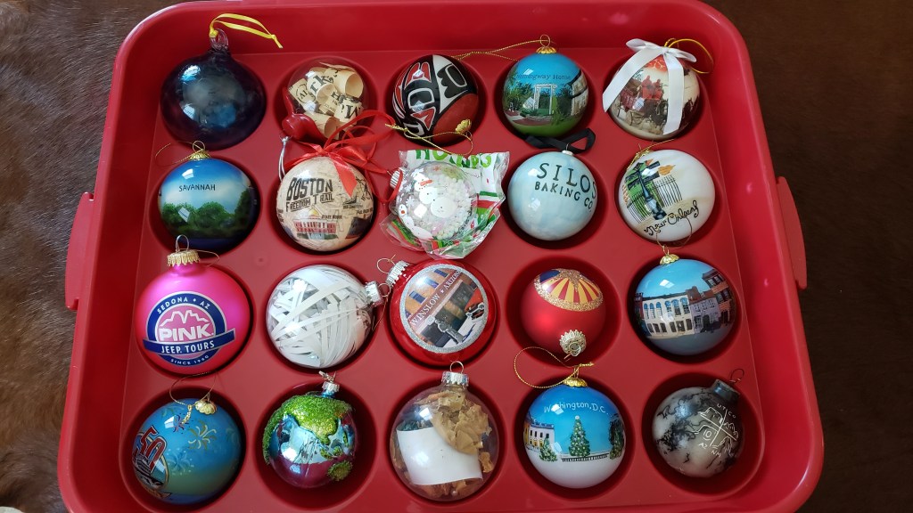 Christmas ornaments and snow globes. I’m listing these two together because they both come with a challenge … getting them home safely. Despite that challenge, I admit to collecting ornaments. Once a year, Greg and I pull out our collection, decorate my twinkle-light-wrapped tree and share the memories. My trees keep getting taller … sooner or later I will run out of space to hang them during the holidays … maybe.