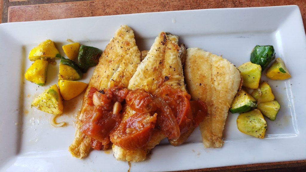 Moving on to the entrees … and a gobsmacking choice of mouth watering delights like Ancho-chile rubbed filet mignon or Pacific Coast sand dabs. We ordered both and split them … voila … surf and turf!
