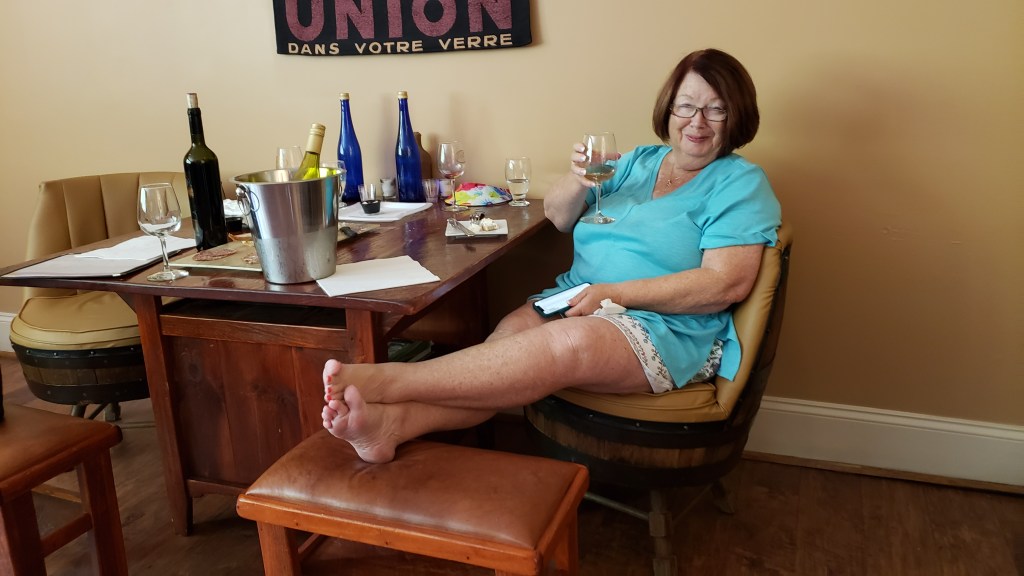 The make-yourself-at-home comfort was easy and restful. After sharing the wine tasting flight, we ordered up a bottle each so we’d have leftovers to take back to the hotel. We laughed and chatted as the tasting room filled with families, couples, and small groups of friends seeking the same festive atmosphere we’d captured. Bottles sealed for the drive back to Fredericksburg, we perused the gift shop and Kathleen ordered several bottles to have shipped home.