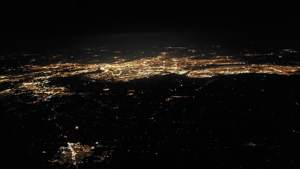 I’m not sure how long I napped. I didn’t bother to check my phone. When I woke, it was clear. Solid blackness punctuated by sparkling dots of stars above and shimmering golden flecks of light from the towns and cities we flew over. It was a captivating scene.