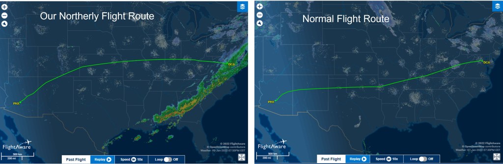 The pilot made the announcement, then offered a bright spot: Once we got above the clouds and to the north of the current weather, we’d likely have smooth air all the way west. He also said despite our 15 minute delayed take-off, we were running about 10 minutes ahead of schedule and he was working with air traffic controllers to “straighten out” the diverted course, which would get us to our destination even further ahead of schedule.