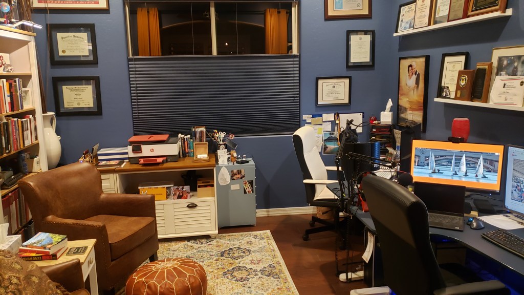 I’m VERY lucky that Greg appreciates a little shake-up in our lives regularly as much as I do. The other day, we were standing at the door of our home office, gazing unhappily at it. There was something that could be better. We came up with a few ideas, got out the measuring tape and rearranged the whole room. We love the new look.