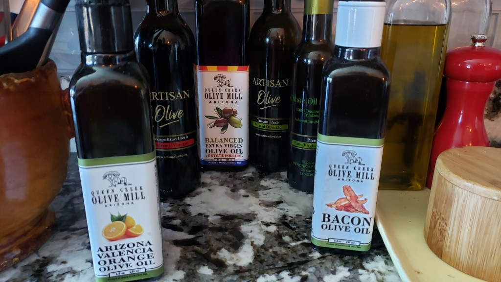 In our area, we have the right weather for olive trees, so there’s a company in the valley that grows, harvests and presses its own olive oil. It’s spectacular. I toured once and now make bi-monthly trips for fresh oil in several flavors.