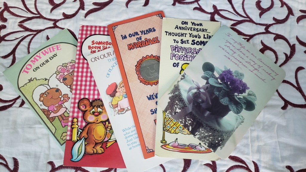 Every now and then I take a bit of time to flip through the box where I keep these penned treasures. It always makes me smile as I re-read the memories carefully written in ink, pencil and crayon. We even have a small collection of anniversary cards between Greg’s dad and step-mom.