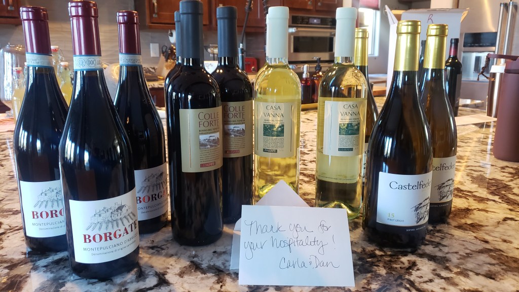 Over the weekend, we received our monthly wine club shipment. In addition to the three bottles we expected, Liza delivered an additional case. When I asked her about it, she said a friend contacted her and arranged for the surprise. It was a completely over-the-top thank you gift for hosting them in our home. WOW!