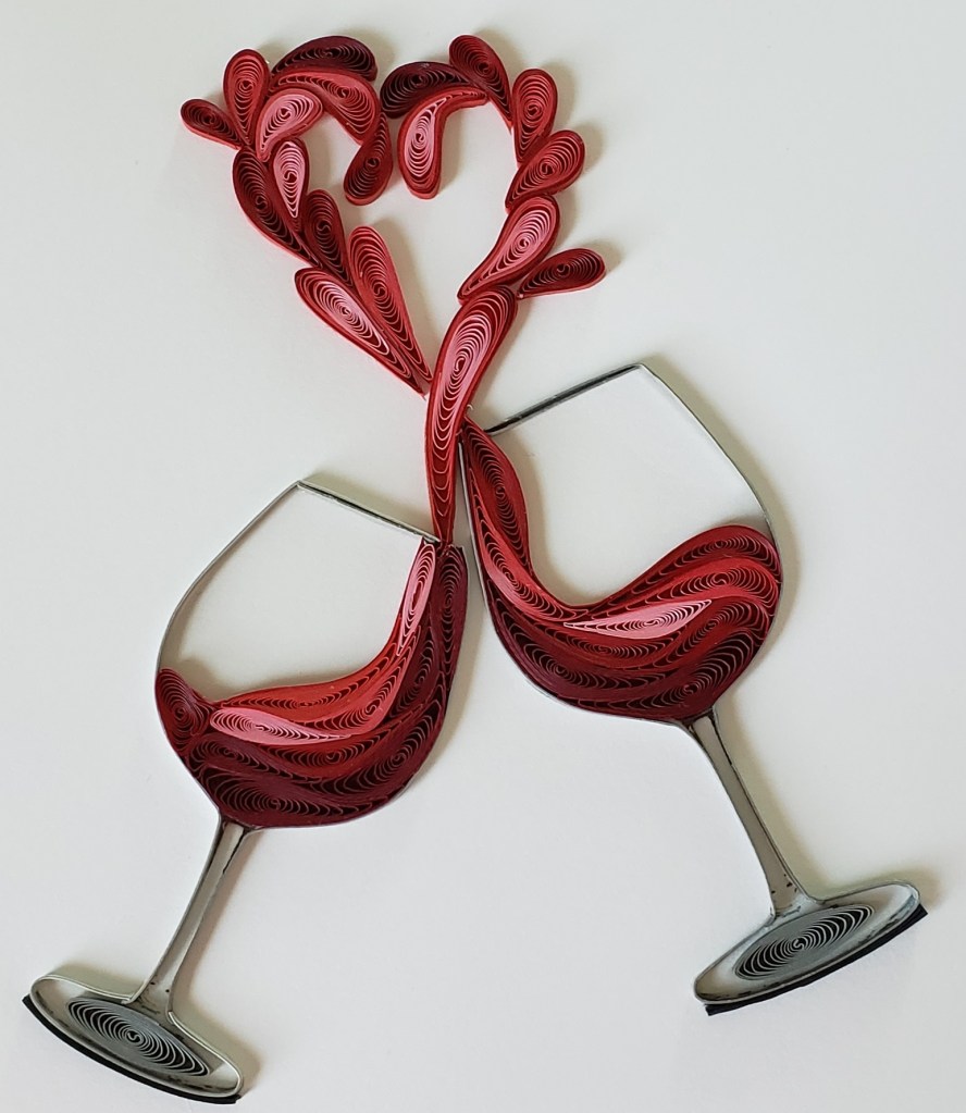 During a video meeting a few days ago, a colleague asked about a few items on the bookshelf in our office. One of them was a greeting card, the cover composed of tightly and intricately wrapped colored paper making a heart- and wine-shaped pattern. As art, it is quite stunning, which is why it sits on the shelf, bringing me joy every time I look at it.