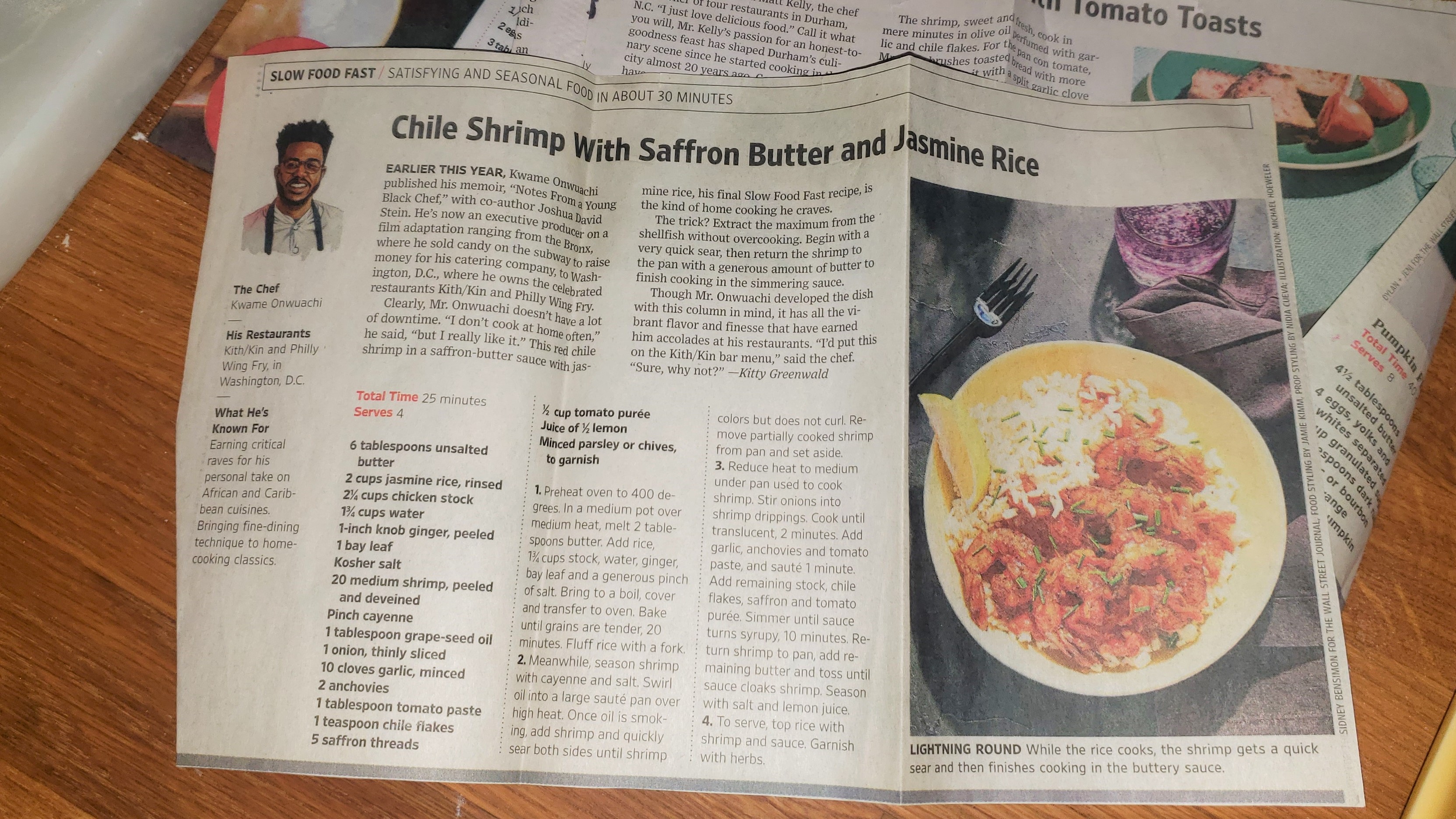 The same neighbors clipped a recipe for some garlic shrimp out of the Wall Street Journal, not-so-subtly hinting they’d love it if we made it for them. We did, and it was fantastic!