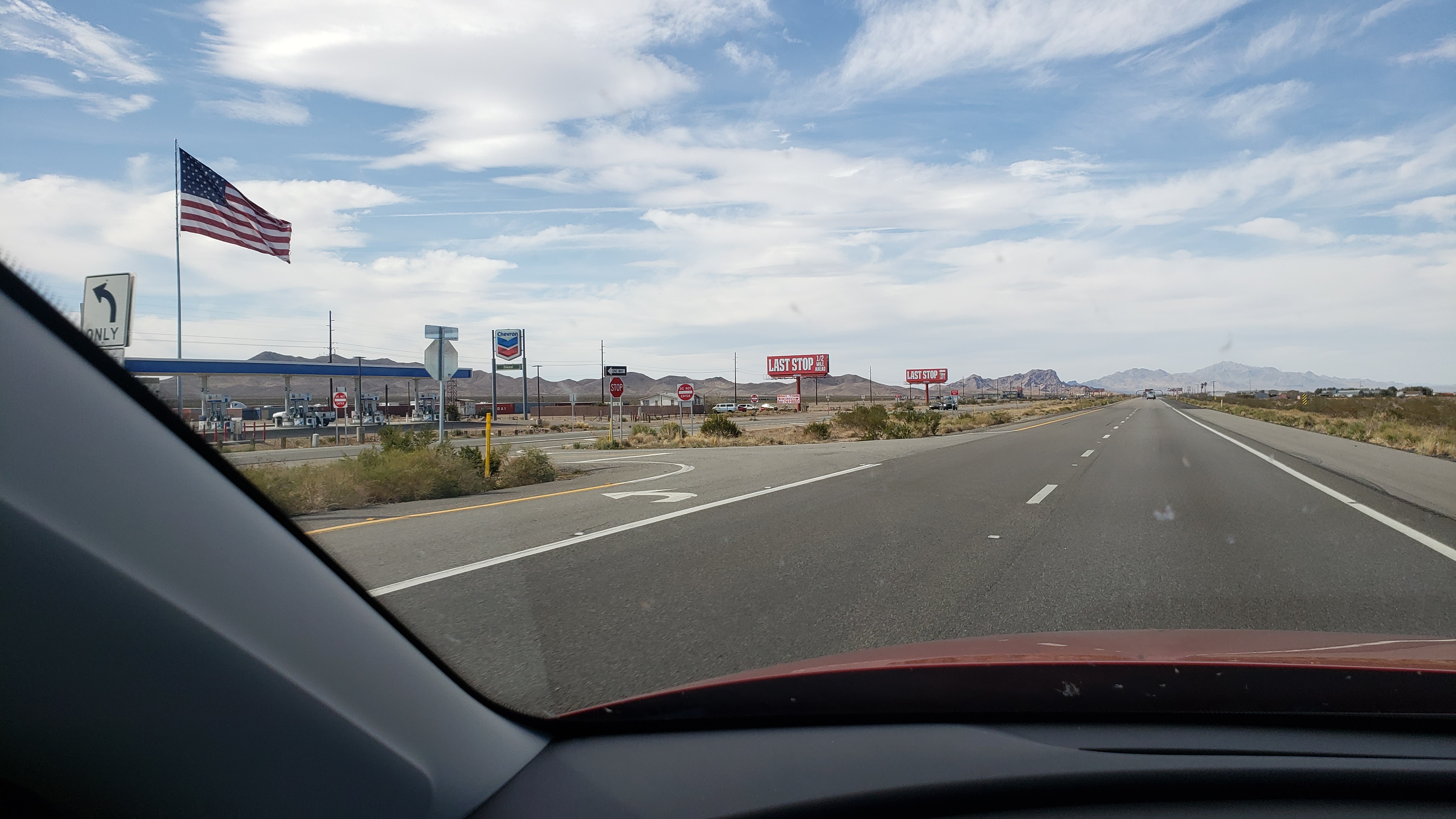 I tuned into my favorite music on the radio, gazed out at the horizon and set the cruise control so my lead foot wouldn’t get the best of me. As I neared the border of Nevada, “Last Stop” signs filled my view. I laughed as I passed one after the other … was there actually a “last stop?”