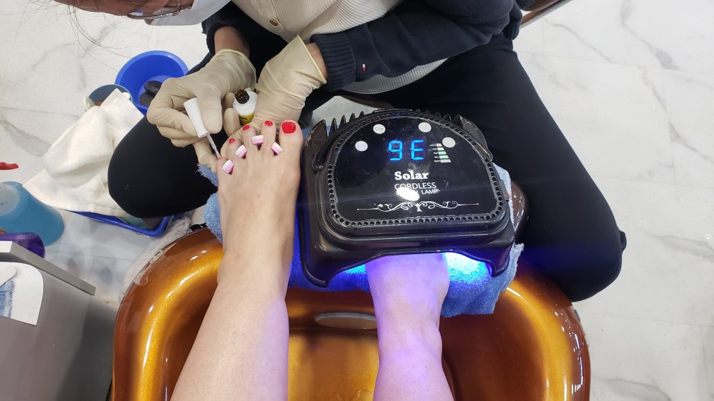 For all you guys out there wondering what it’s all about, more often than not Greg joins me. He’s even gotten color several times, although mostly he just gets to enjoy all the rest of the pleasures that go with a great pedicure.