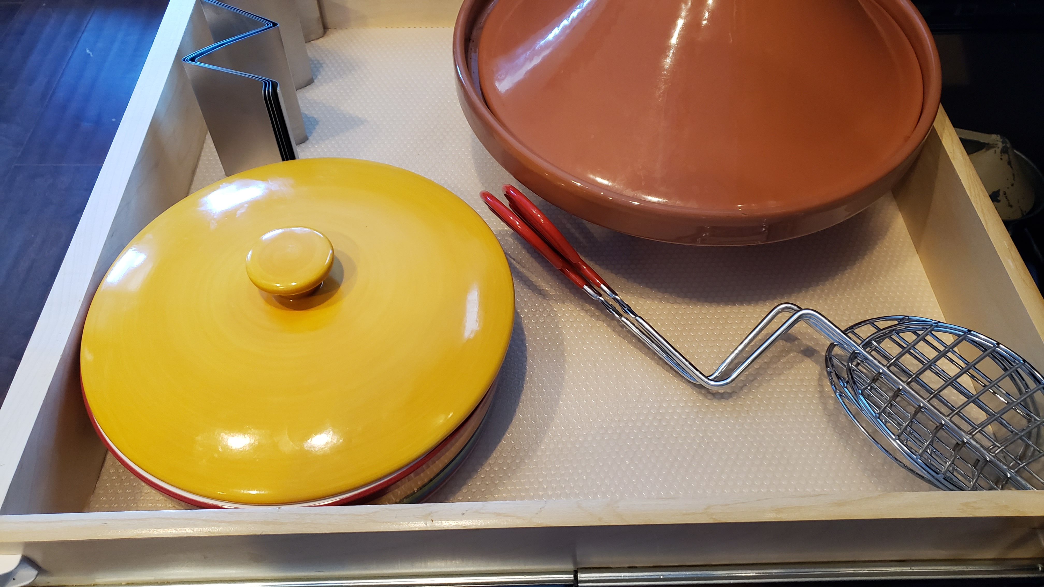It took about three hours to get most of the cabinet slide-out drawers lined. It included removing everything, spraying on cleaner and giving them all a good wipe down, and sizing (and trimming) the liners. I stepped back to admire my work.