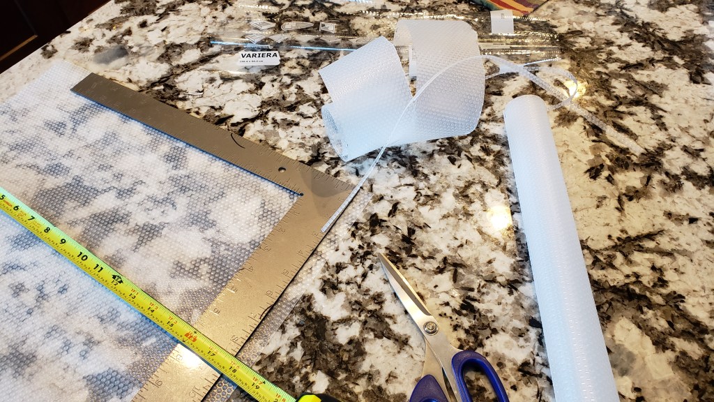 I grabbed all the stuff I would need … the shelf liner, scissors, a straight edge, a box cutter for trimming, and a measuring tape … and I got to work.