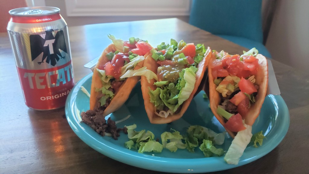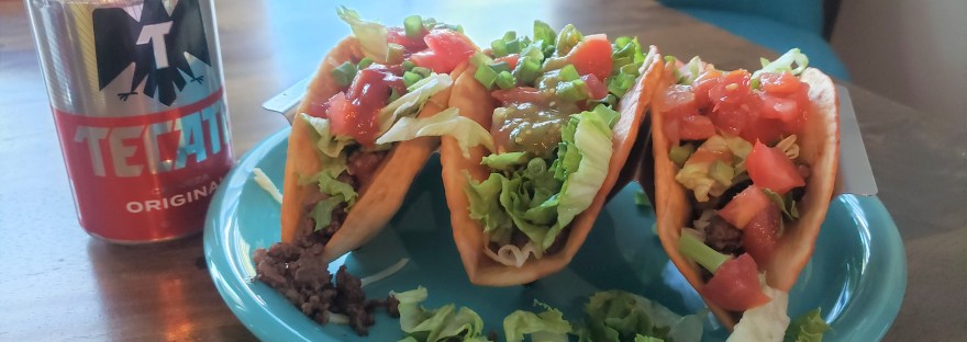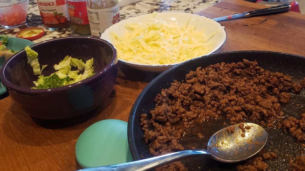 As I grabbed the ground beef that had thawed today for dinner, I thought, “what should we do with this?” Seeing a lone tomato on the counter and knowing we had just a bit of lettuce in the fridge, and it being Tuesday, I quickly answered my own question … tacos!