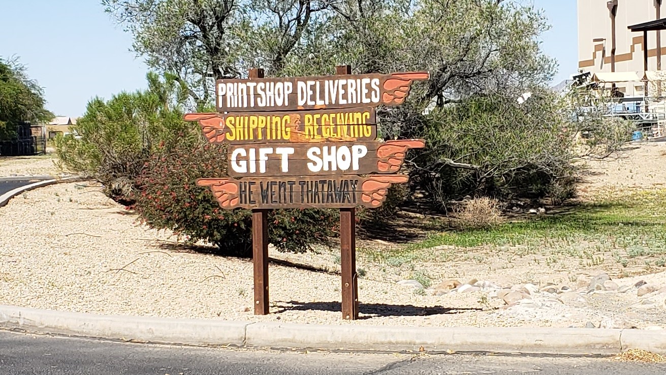 We followed “him” and went thataway to the store parking lot. For a second we worried it was closed … there were no cars. But … the big “OPEN” sign on the door eased our worries.
