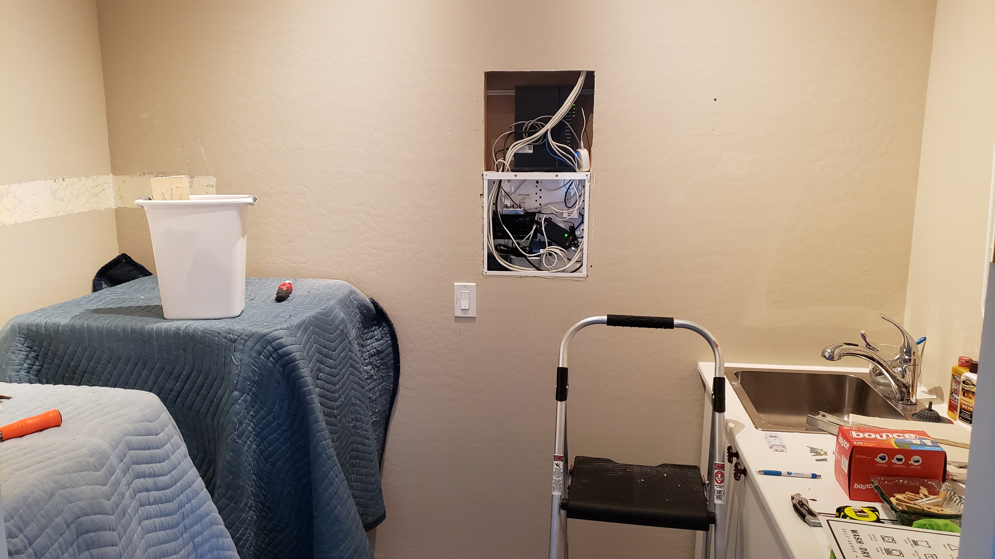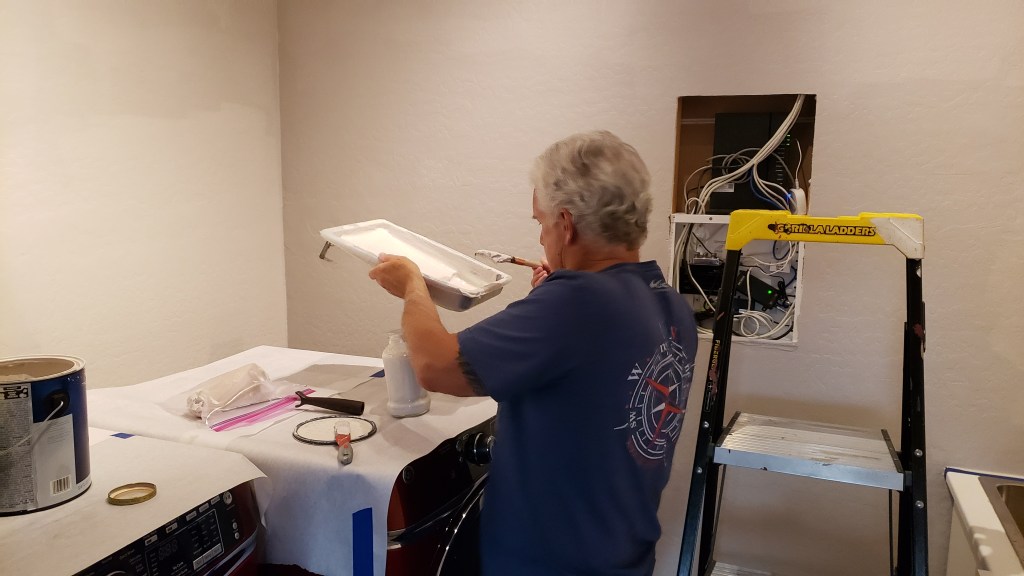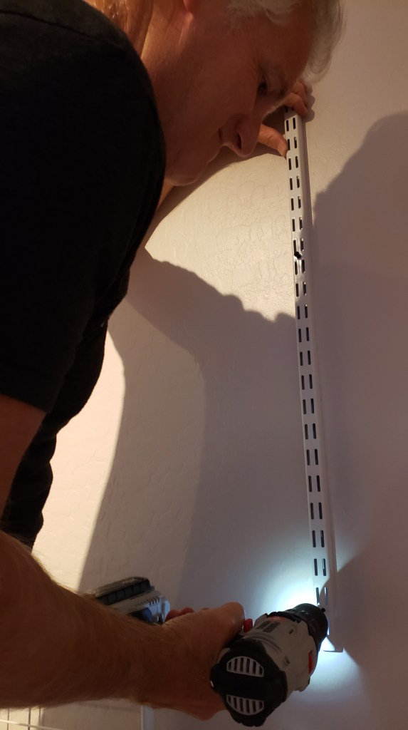 Then we got to work. We took out the old shelf, painted the walls, and Greg hung all the new shelves.