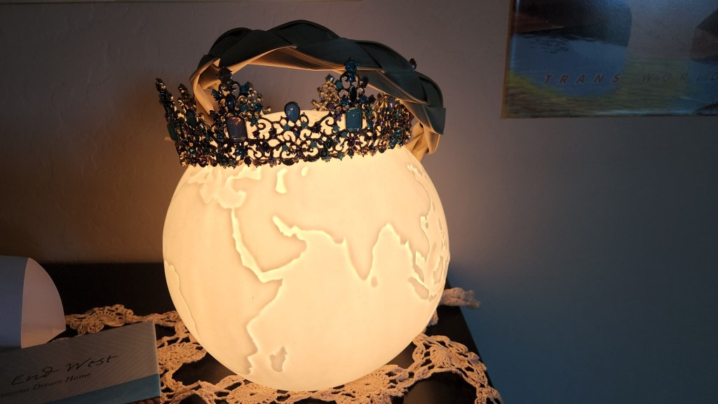 As I took a couple of things back to the guest room, where we are gathering the items we plan to take on an upcoming trip, I spotted a funky, round lamp in the corner. I found that lamp online years ago and it still makes me smile.