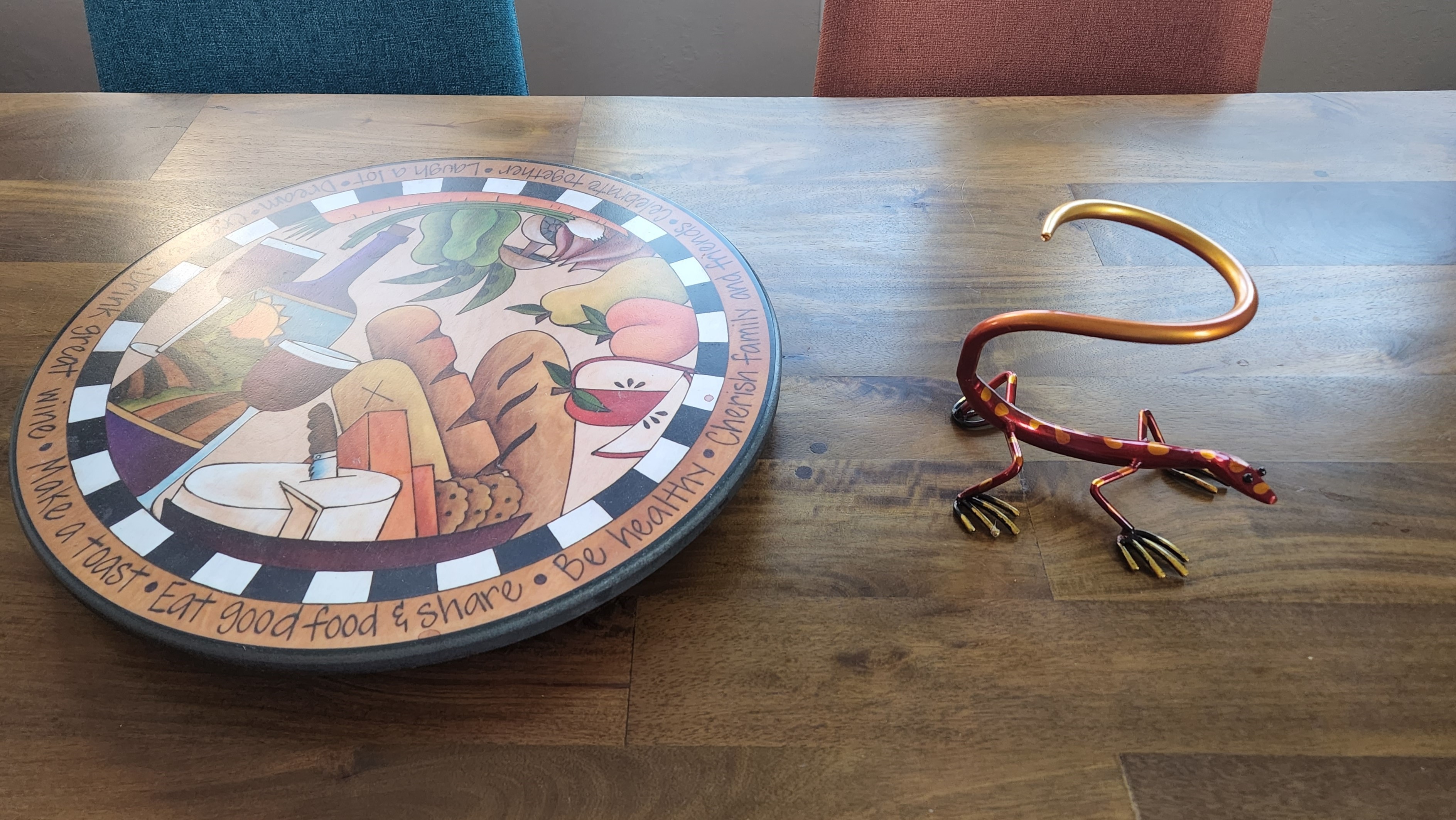 On the dining room table is an adorable little lizard who holds a bottle of wine during dinner. That little guy makes me smile everytime I see him. Next to him is a lazy Susan hand painted by an Iowa artist that I found on a vacation to Oregon. It’s not only the perfect addition to my table, but a useful and fun souvenir.