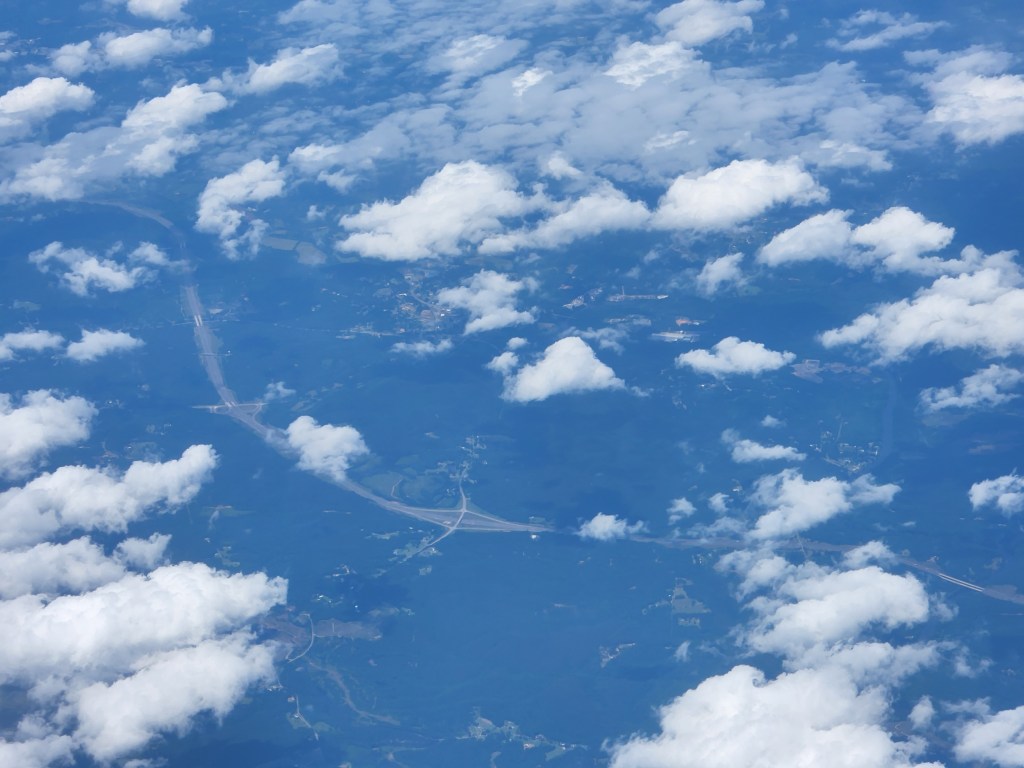 After completing some work I needed to take care of, I was able to watch the world go by out the window. I watched the Arizona desert turn into New Mexico and west Texas. A few light, puffy clouds joined the blue sky, then I spotted the green trees and fields that bordered the Mississippi River as we crossed over Louisiana. Highways stretch out in the distance, beckoning the road tripper in me.