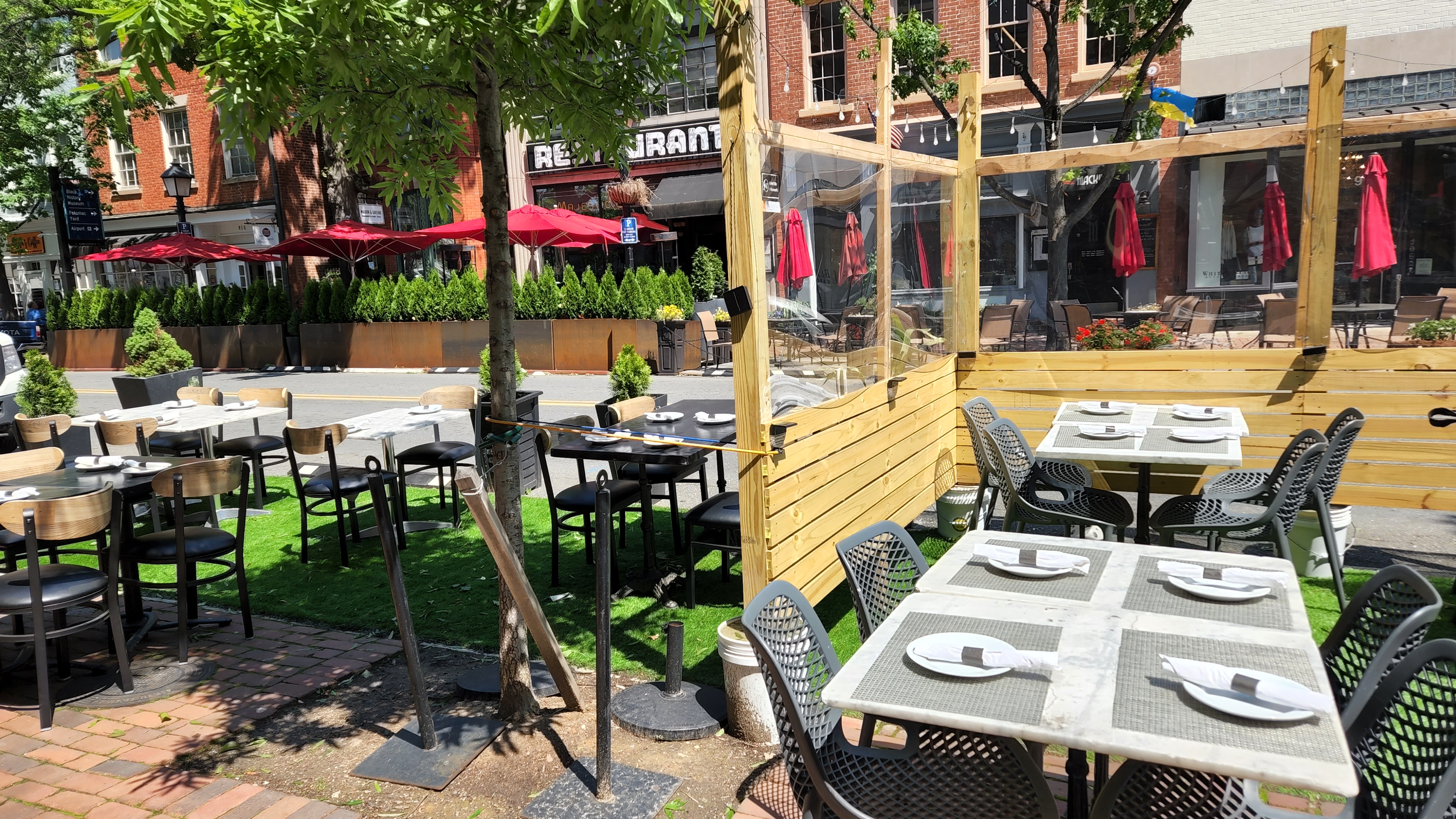 Restaurants have taken over the street parking spaces and created dining rooms behind hedge-filled planters and temporary pony walls.