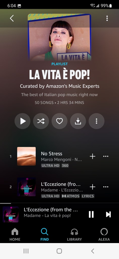 Prepping for our trip to Italy, I wanted to play some music that would brighten our already anticipatory mood. Grabbing my phone, I pulled up Amazon Music and looked up “Italian Pop” playlists. Up came “La Vita è Pop!” The 50 song, two-hours long playlist is “Curated by Amazon’s Music Experts” according to the description. I asked Alexa to play it, and we listened to bouncy, fun Italian pop music while we continued packing. What fun!