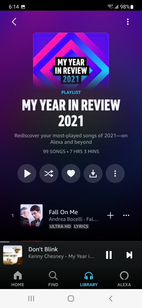 It turns out Amazon’s curated playlists are pretty good, too. I’ve listened to Hard Rock Workout while pumping iron and Relaxing Rain Sounds when sleep comes furtively. Judy and I listened to their station Spa when giving each other massages. They’ve even created a My Year in Review 2021 of our 100 most-played songs … seven full hours of music!