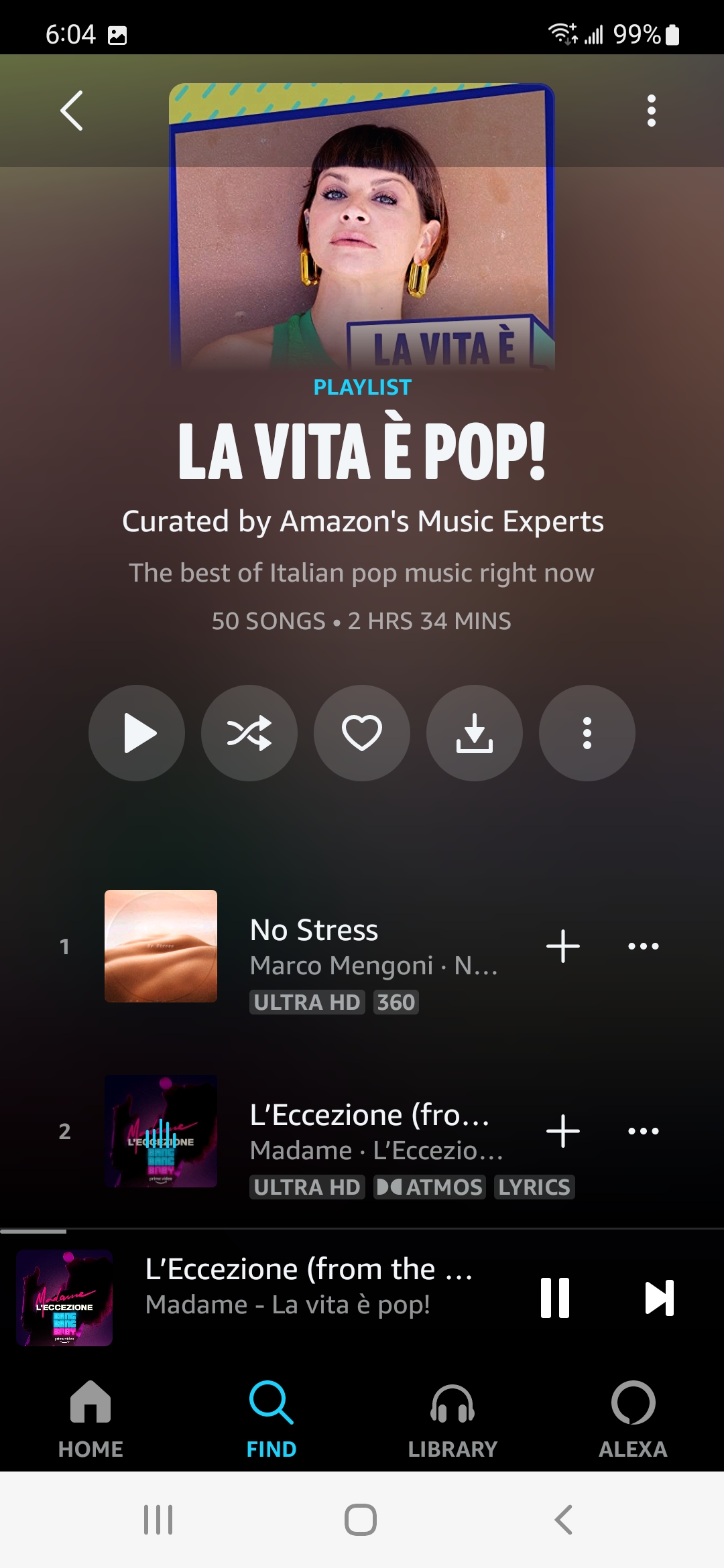 Prepping for our trip to Italy, I wanted to play some music that would brighten our already anticipatory mood. Grabbing my phone, I pulled up Amazon Music and looked up “Italian Pop” playlists. Up came “La Vita è Pop!” The 50 song, two-hours long playlist is “Curated by Amazon’s Music Experts” according to the description. I asked Alexa to play it, and we listened to bouncy, fun Italian pop music while we continued packing. What fun!