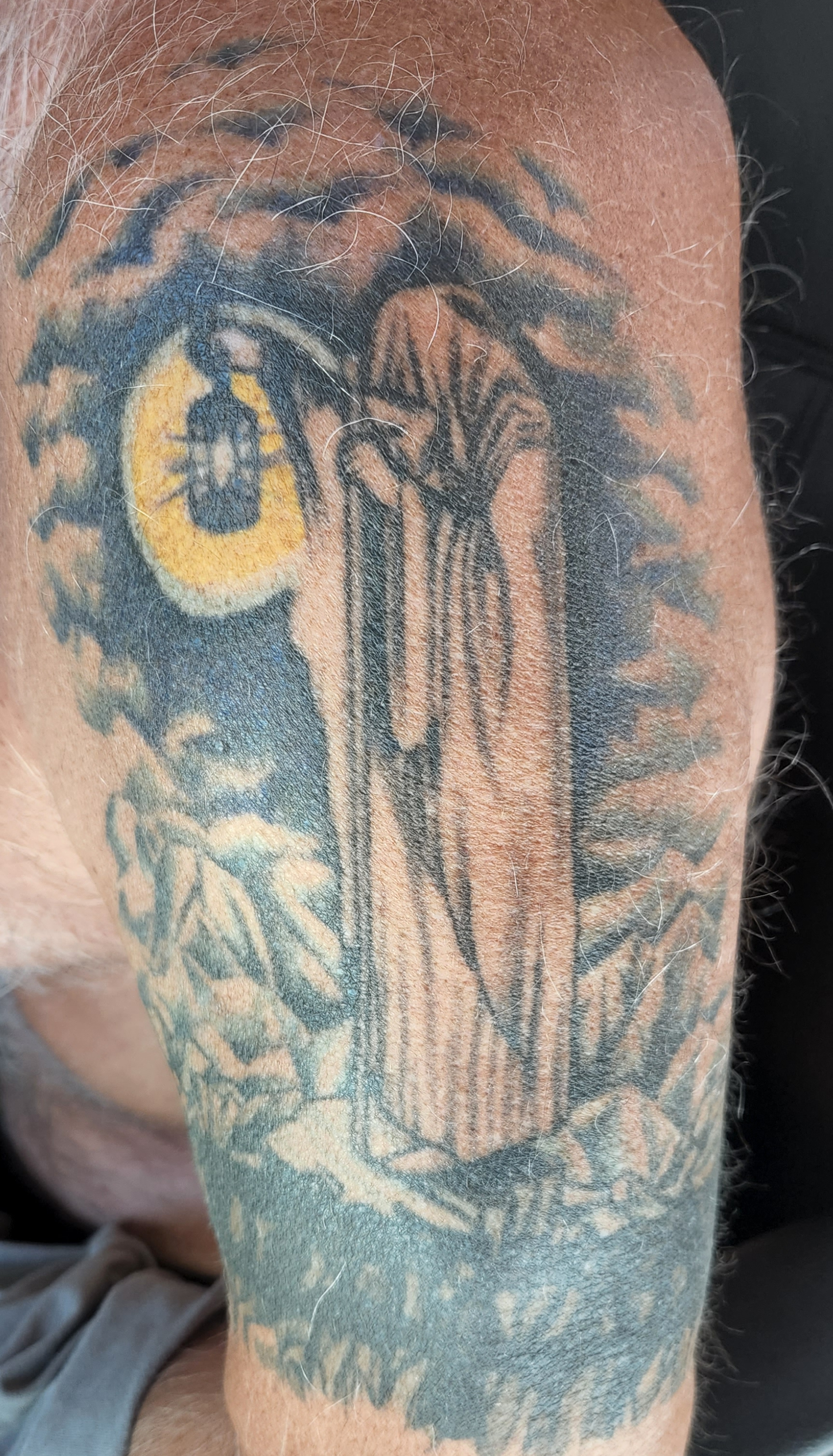 Greg also spent years considering what mattered enough to him to add to his flesh. One of his almost half-sleeves is an image of The Hermit tarot card. To him, it represents the never-ending search for truth and enlightenment. It speaks to so much of what he believes in.