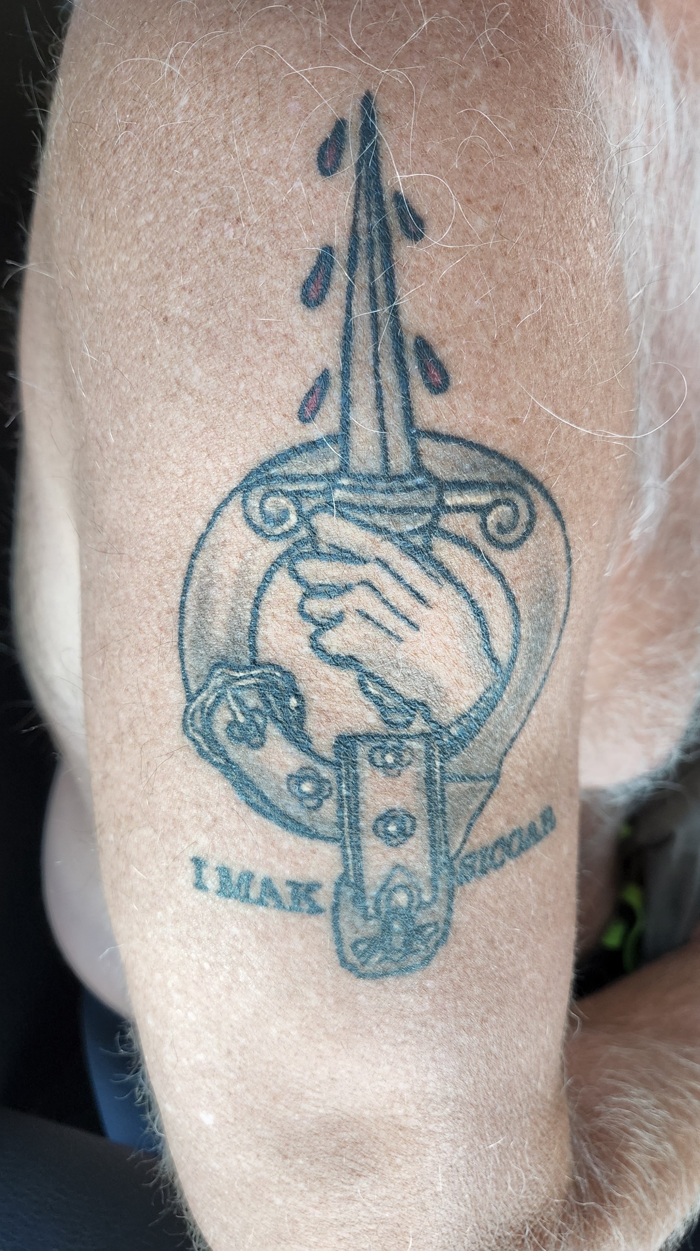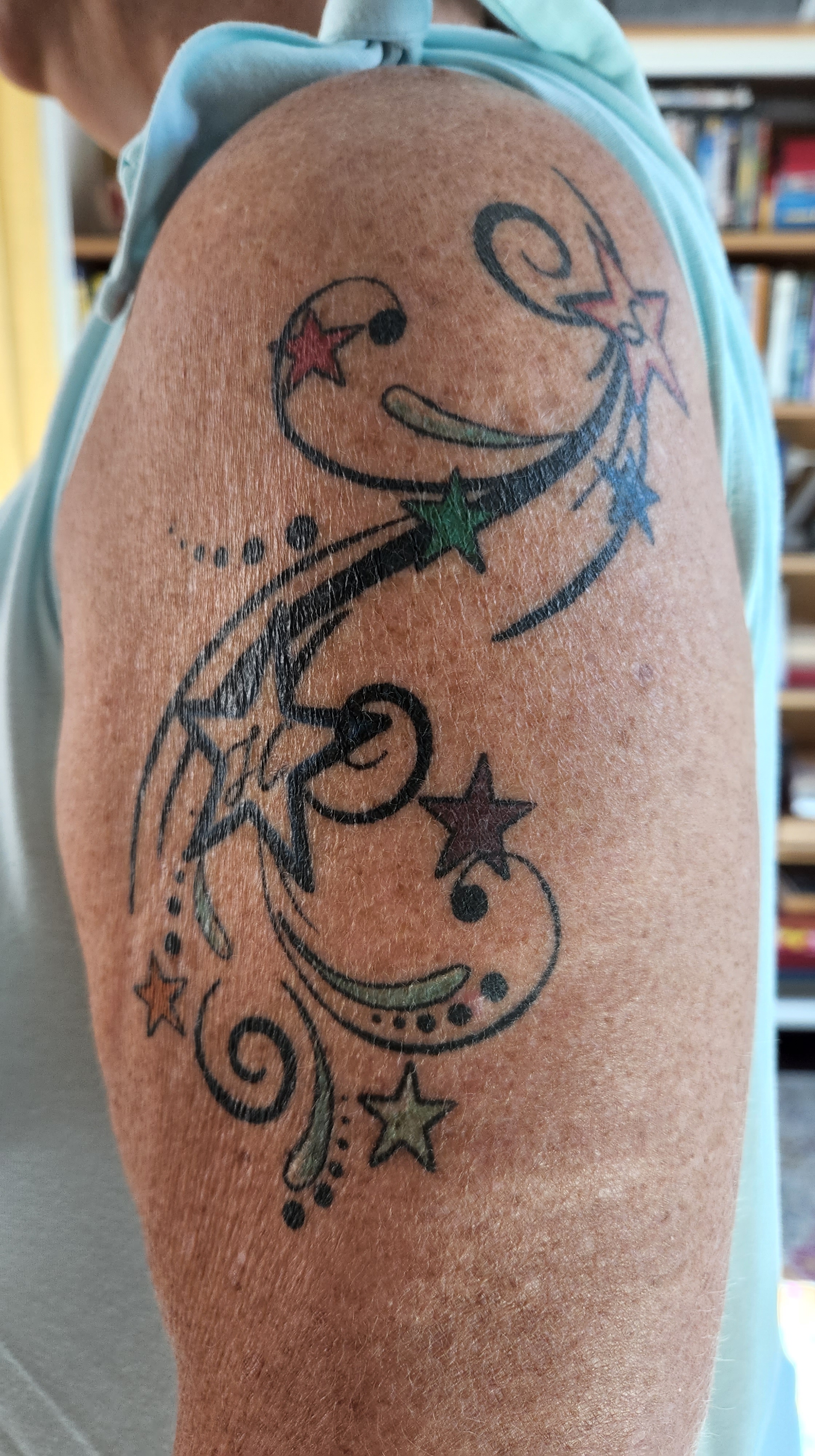 Since then, we’ve added more ink to our bodies. I have a sweeping swirl of stars and hearts that represent my two children and six grandchildren. Greg discovered a centuries-old family crest with an incredible story and deep meaning of faith and loyalty.