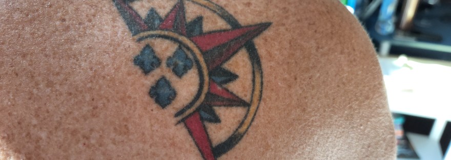 The other cautionary note I heard repeated was once you get your first one, you will want more. It’s true. That first quarter-sized tatt turned into the center of a larger work of art. I wanted half a compass rose, in full color. I explain to those who ask that I will add the other half when I’ve seen everything I want to see.
