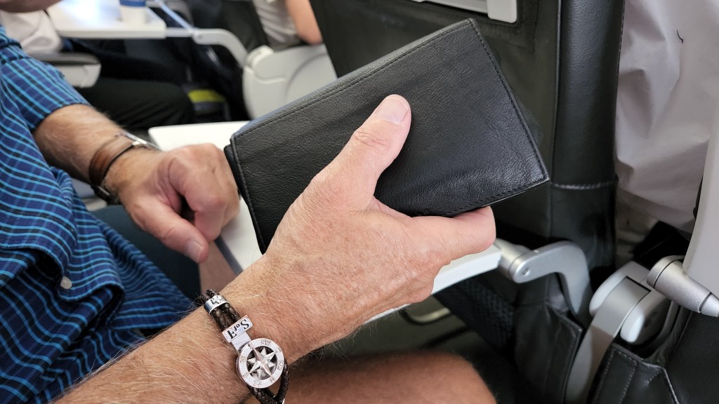 Since I will NOT ever wear a fanny pack or carry even a small daypack so favored by many Americans, the solution was a small leather case that Judy found online at Levenger. About the size of a paperback book, it’s the perfect size to hold all these things plus my American cash for when we get back home. It fits easily in the palm of my hand, not unlike a woman’s clutch. It’s my new man-purse, or murse.